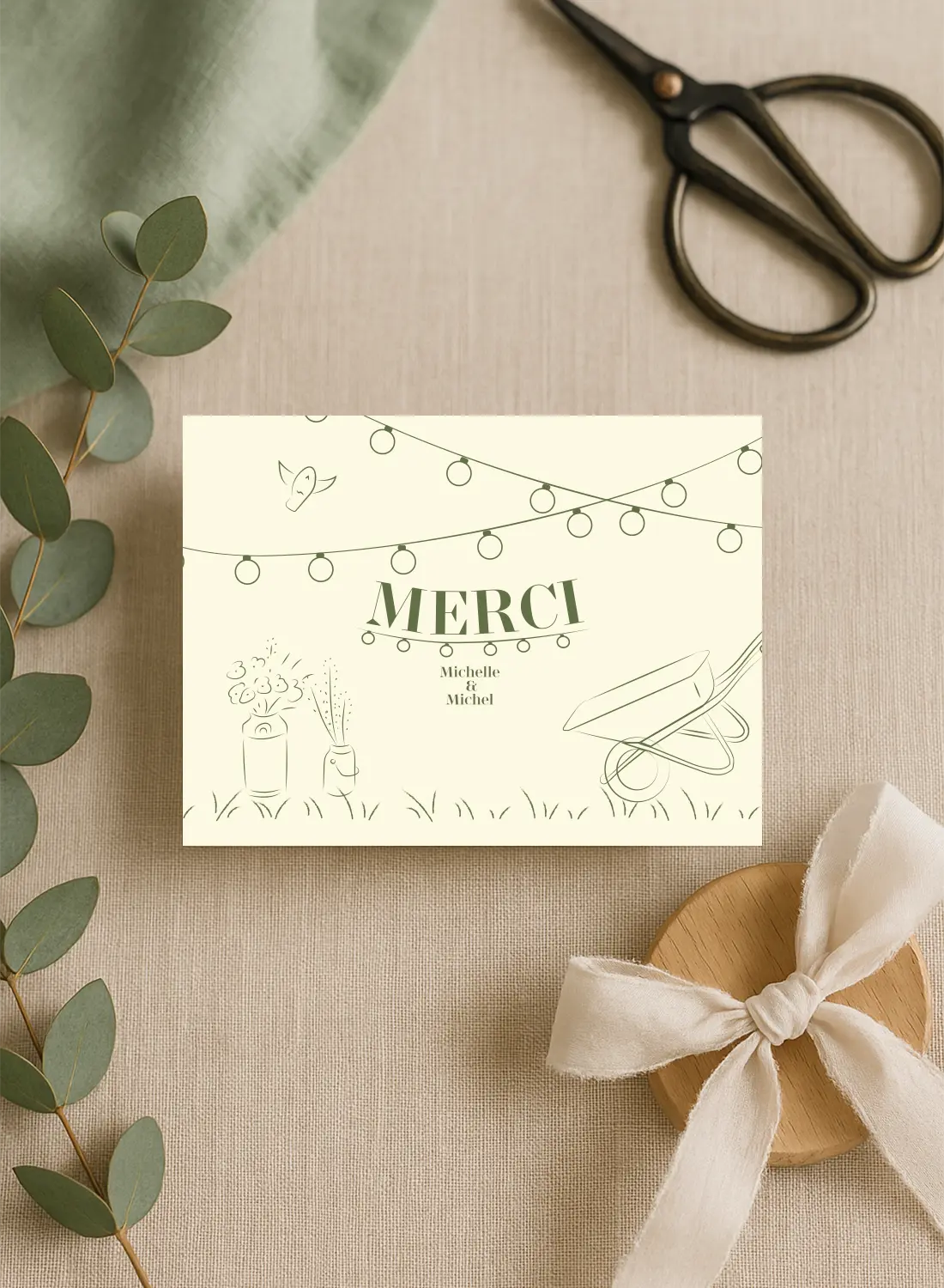 Cette carte reprend l’univers graphique de la collection avec délicatesse : guirlandes suspendues, petits bouquets en pots, brouette et herbe fraîchement coupée. Le mot “Merci” est au centre, entouré des prénoms des mariés dans une typographie douce et affirmée.
