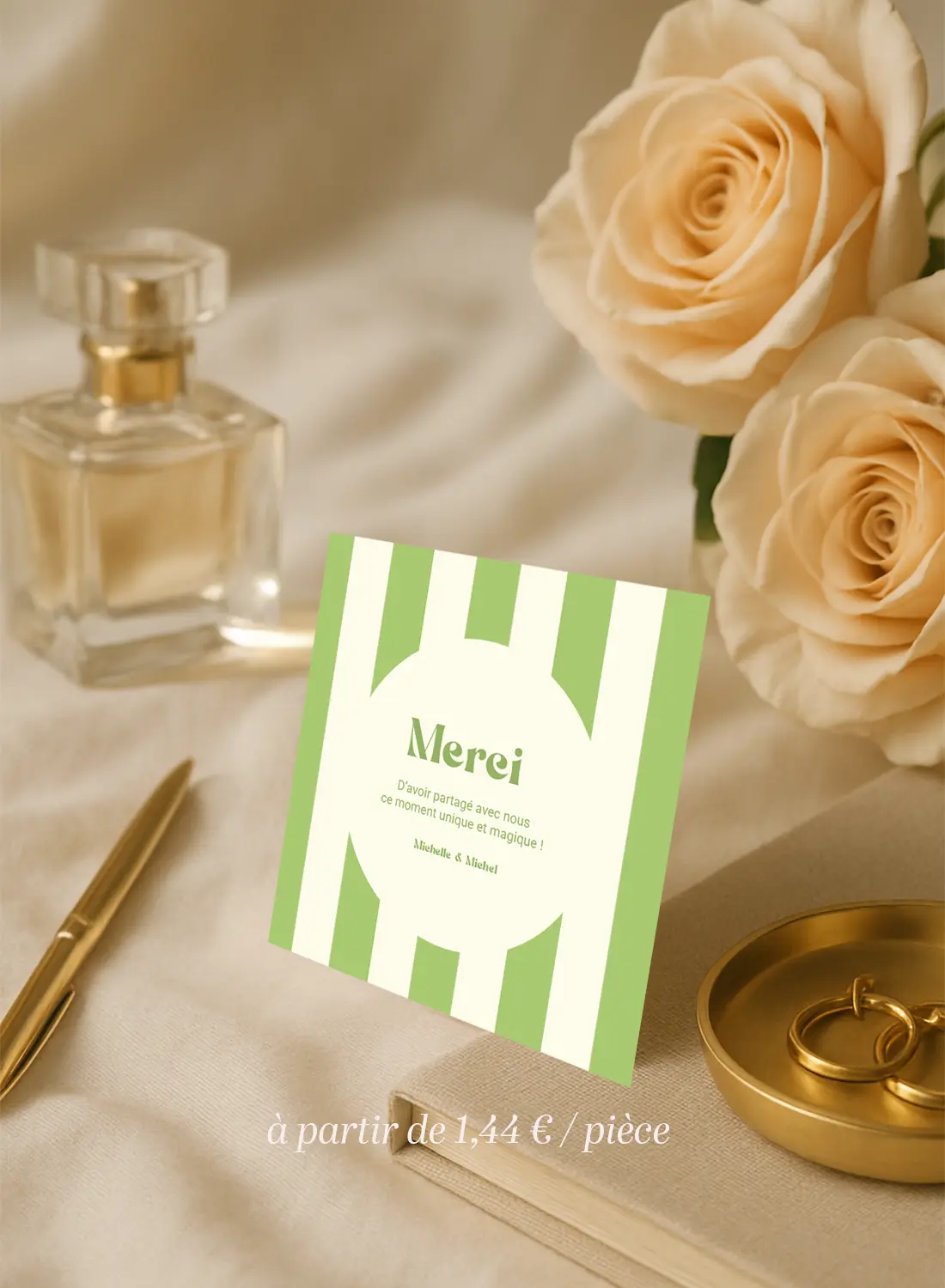 Cette carte de remerciement reprend les codes graphiques de la Collection Printemps avec ses rayures vertes et crème. Un message court mais chaleureux s’y inscrit avec délicatesse, pour remercier vos invités d’avoir partagé ce moment précieux.