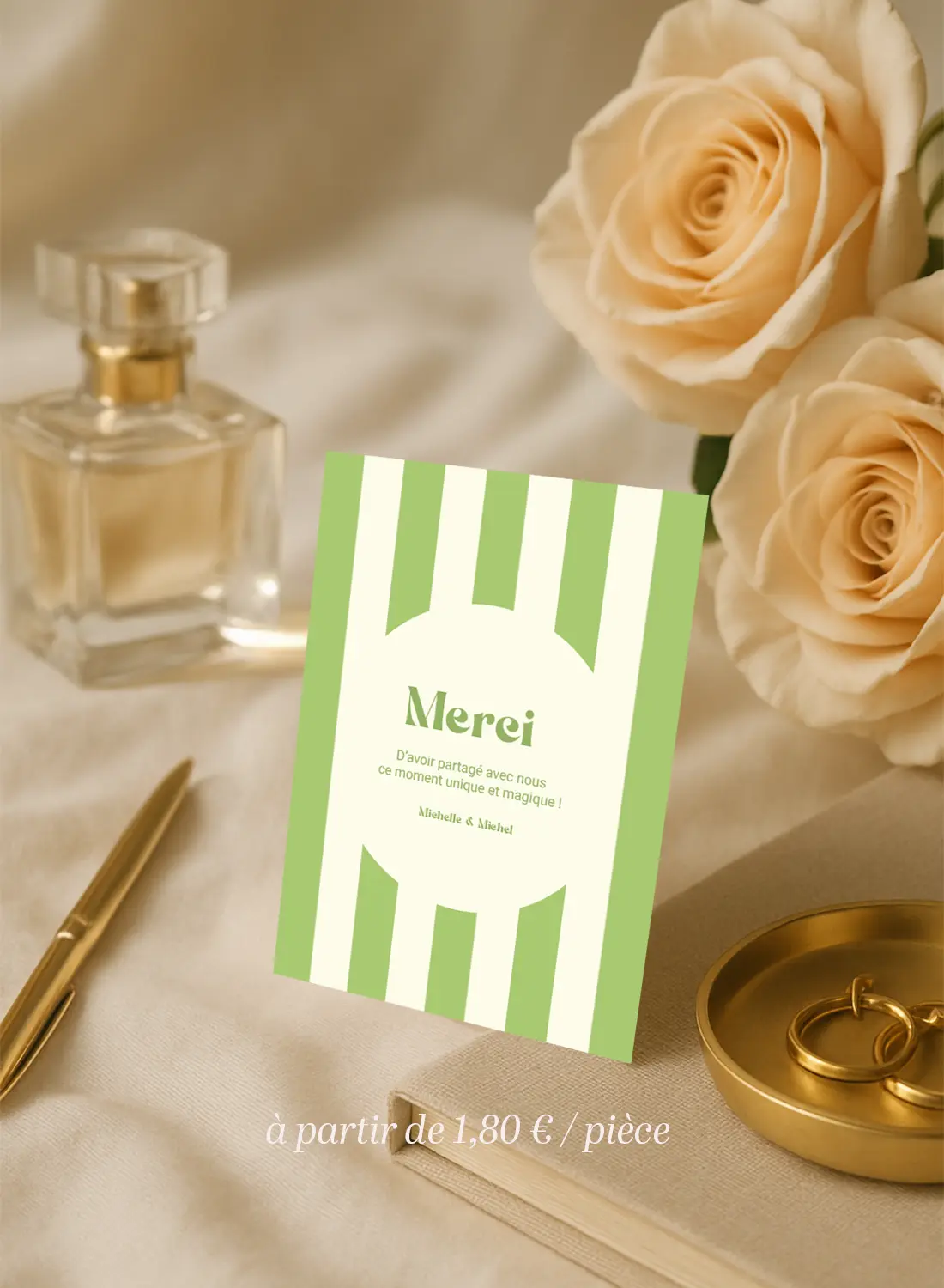 Cette carte de remerciement reprend les codes graphiques de la Collection Printemps avec ses rayures vertes et crème. Un message court mais chaleureux s’y inscrit avec délicatesse, pour remercier vos invités d’avoir partagé ce moment précieux.
