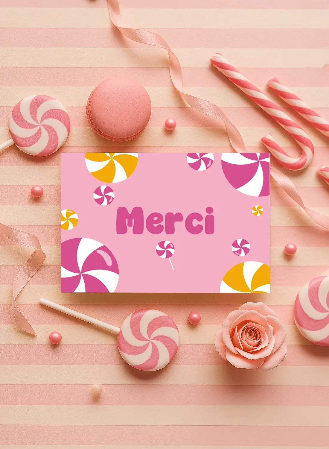 Une carte de remerciement festive et gourmande, ornée de sucettes colorées sur fond rose – parfaite pour remercier vos invités avec un sourire sucré !