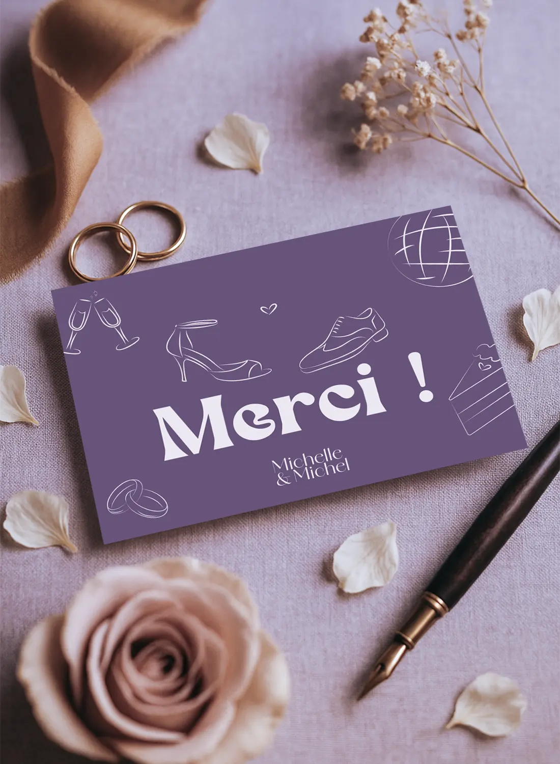 Carte de remerciement Aubergine à l’ambiance festive et élégante, parfaite pour prolonger la magie de votre mariage Dolce Vita.