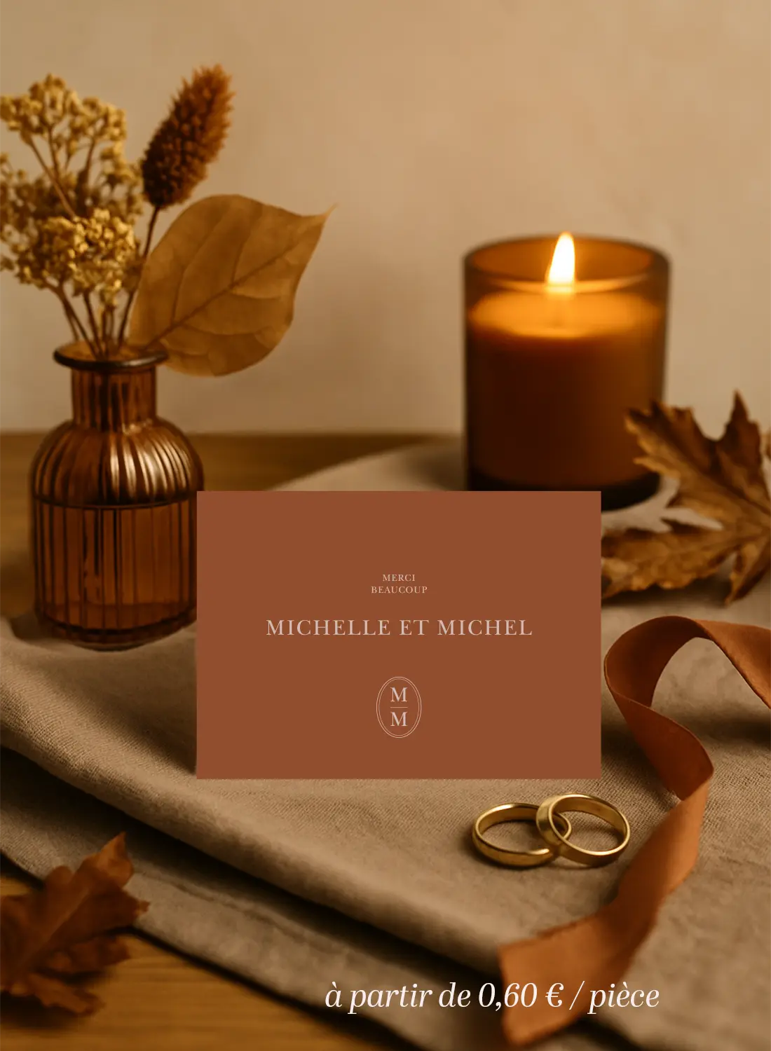 Une carte de remerciement de mariage pensée comme un dernier mot doux, élégant et sincère.
