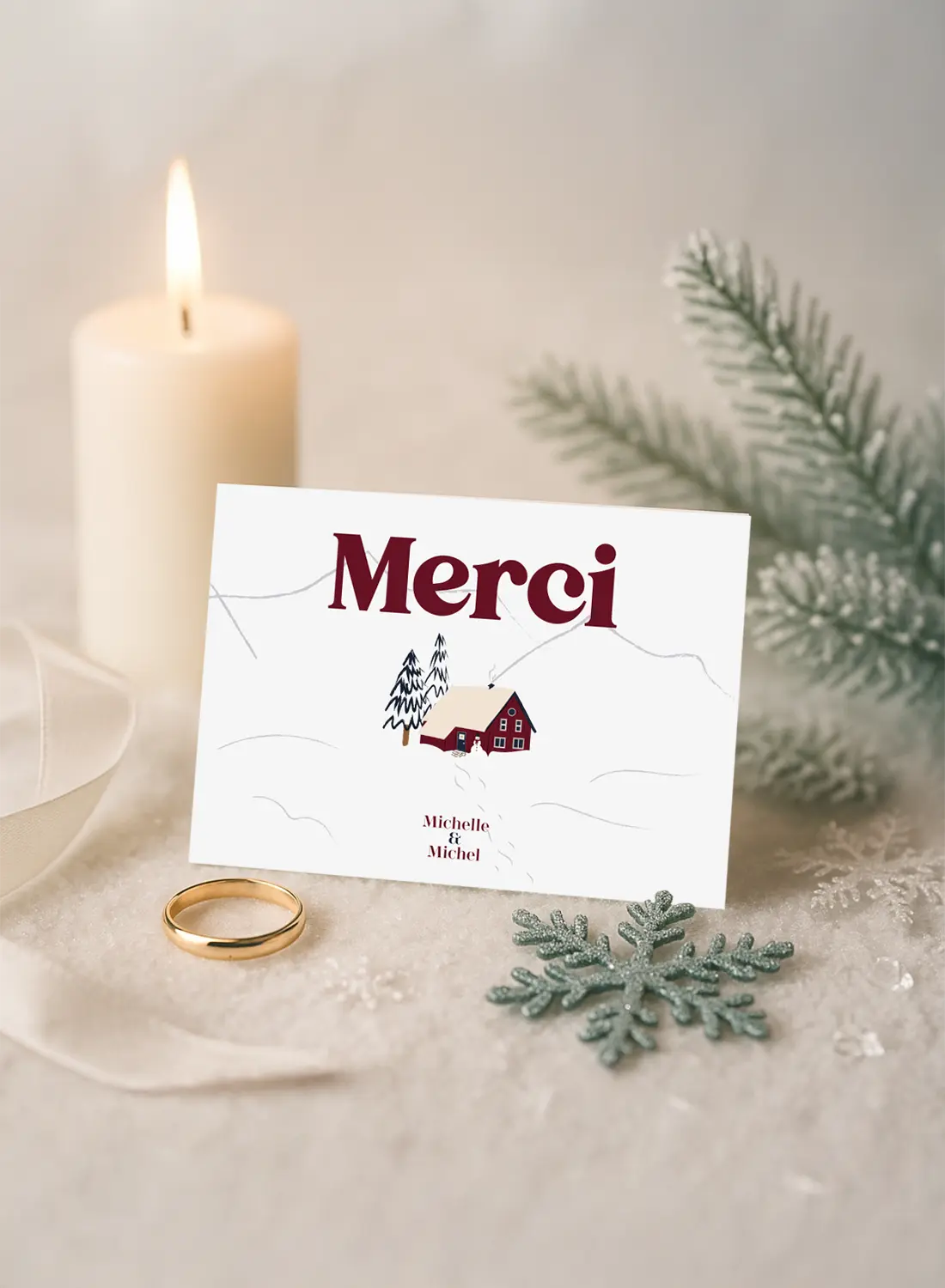 Une carte de remerciement hivernale, illustrée d’un chalet dans la neige, pour dire “Merci” avec chaleur, douceur et une touche de poésie.