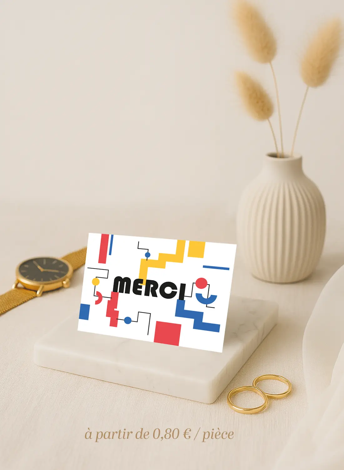 Après un mariage aussi graphique et audacieux, vos remerciements méritent une carte à la hauteur ! Ici, le mot “MERCI” trône fièrement au centre, mis en valeur par un décor tout en lignes, formes et couleurs primaires. On retrouve l’univers Bauhaus dans toute sa splendeur : un joyeux désordre structuré, plein de rythme et de style.