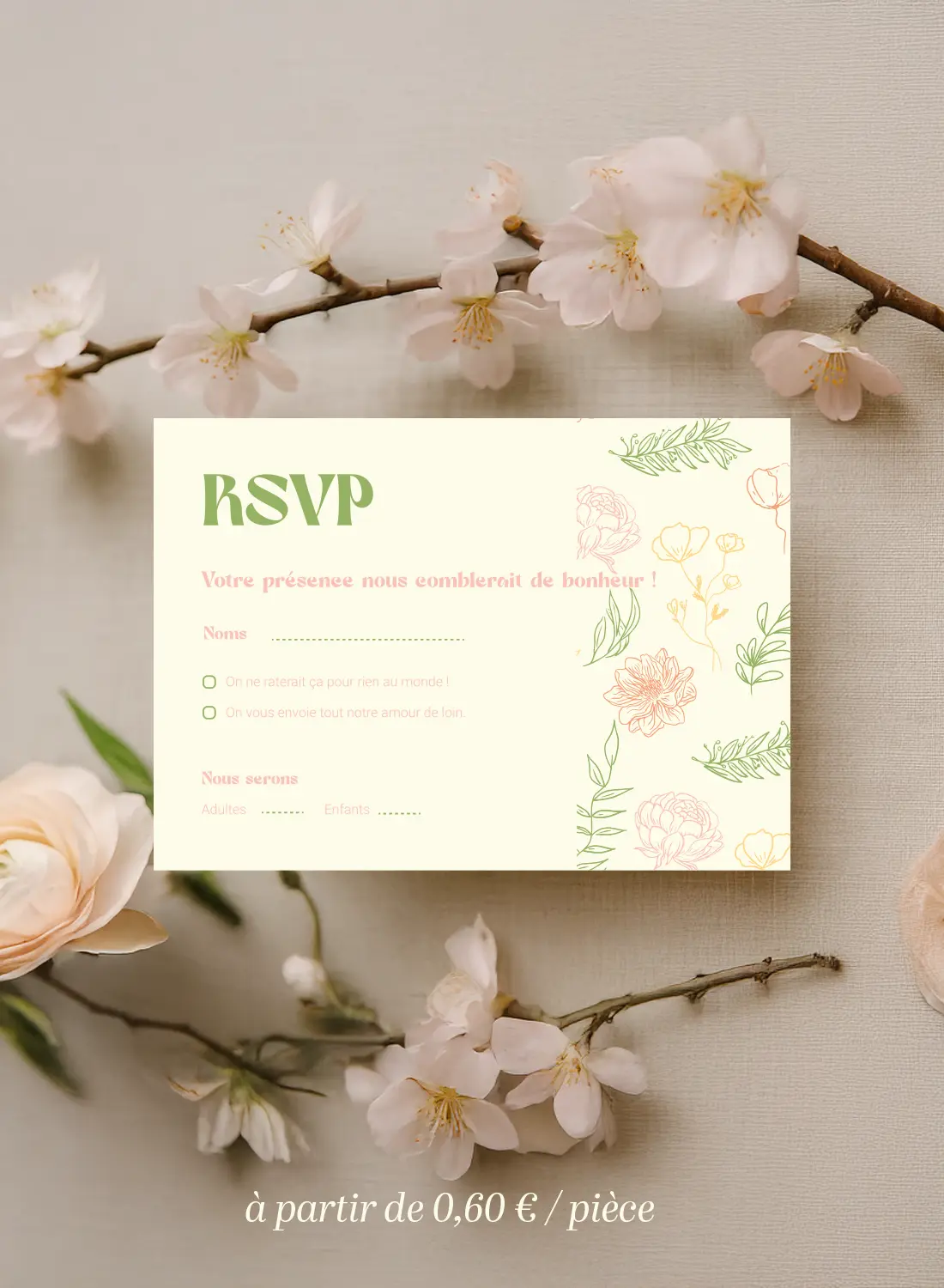 Une réponse (RSVP) fleurie et joyeuse à glisser avec votre faire-part.