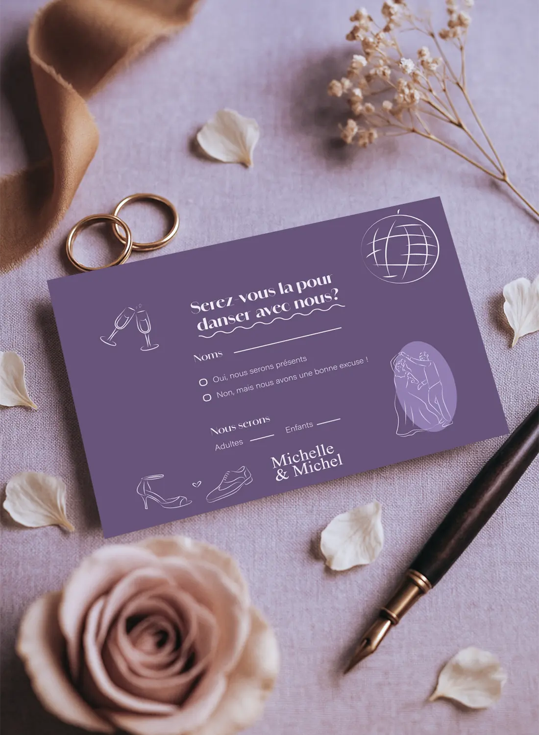 Carte RSVP chic et festive aux tons Bordeaux, parfaite pour recueillir les réponses de vos invités avec une touche d’humour et d’élégance.