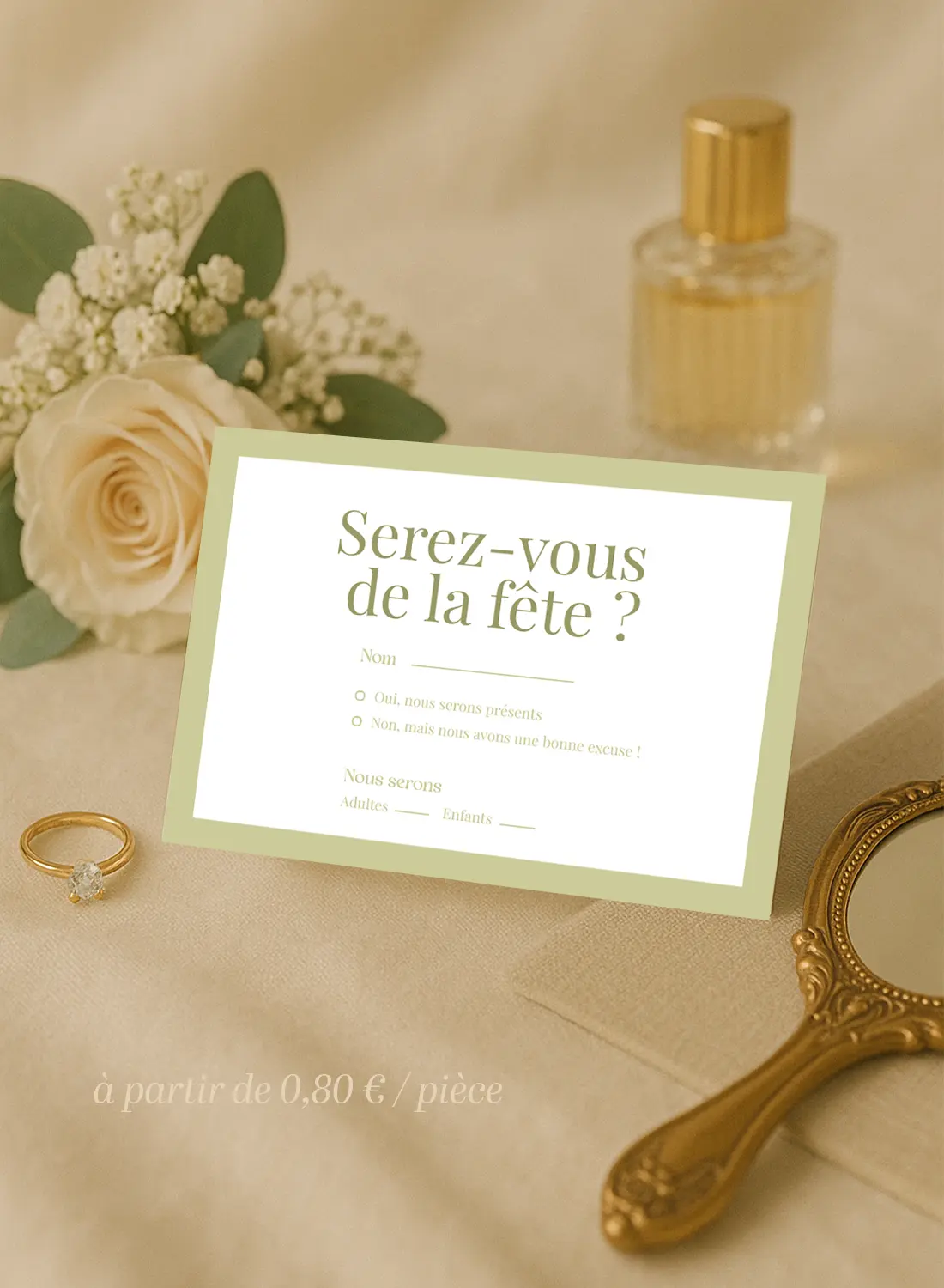 Carte RSVP vert olive au design minimaliste, idéale pour collecter les réponses de vos invités avec élégance et simplicité.
