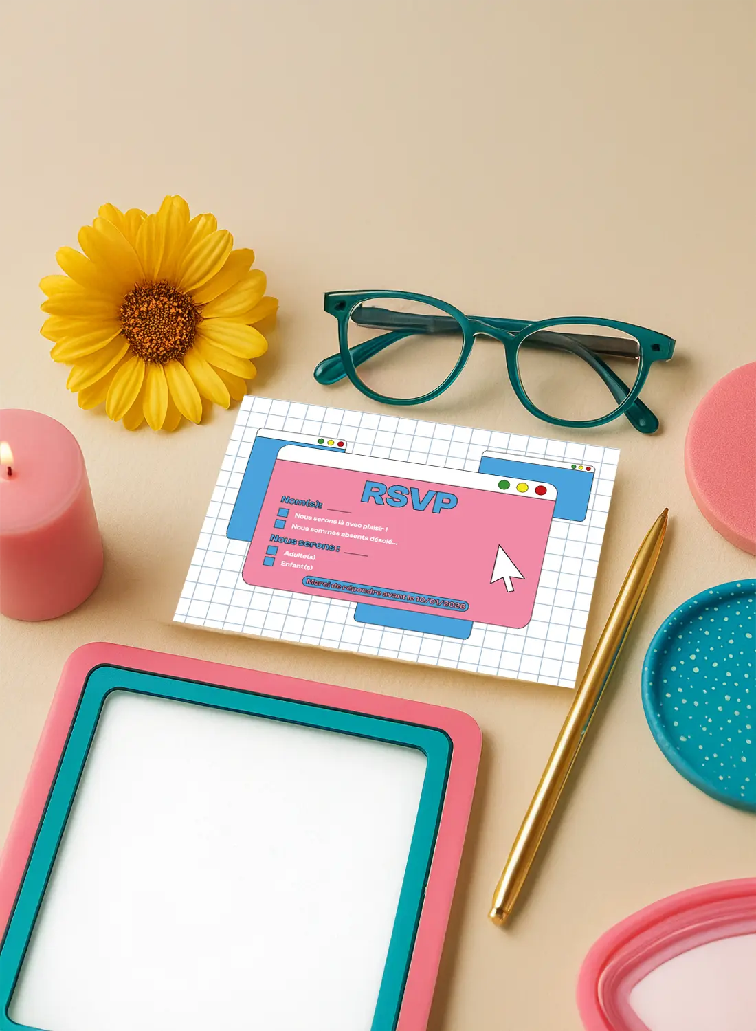 Envoyé avec vos faire-part, ce carton RSVP transforme la réponse de vos invité·es en un véritable retour vers les années blog ! Présenté sous forme de fenêtre pop-up aux bords arrondis, avec son fond quadrillé et ses petites cases à cocher, il reprend les codes visuels d’un ordinateur d’époque avec une bonne dose d’humour.