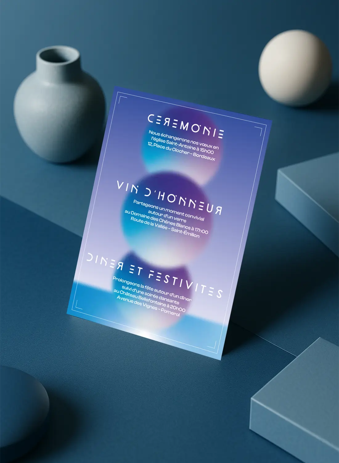 Au verso, trois sphères planétaires s’alignent pour structurer les moments clés de la journée. Chaque étape – cérémonie, vin d’honneur, dîner – est clairement identifiée, avec une hiérarchie fluide et esthétique. Le tout dans un dégradé céleste évoquant le rêve, l’espace, et la modernité.