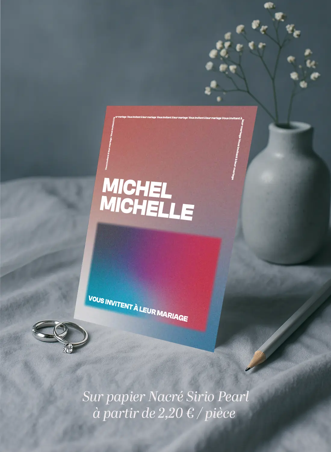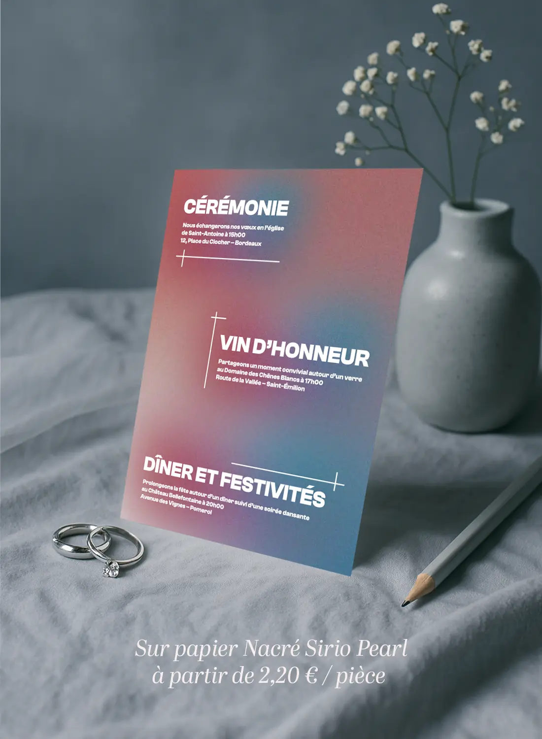 Faire-part de mariage graphique et structuré, recto-verso sur fond flouté coloré. Lisible, intense et moderne, parfait pour un mariage qui marque.