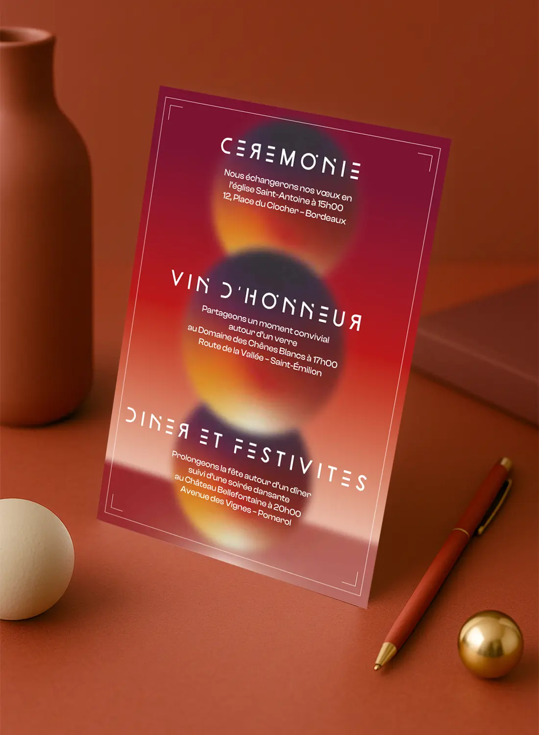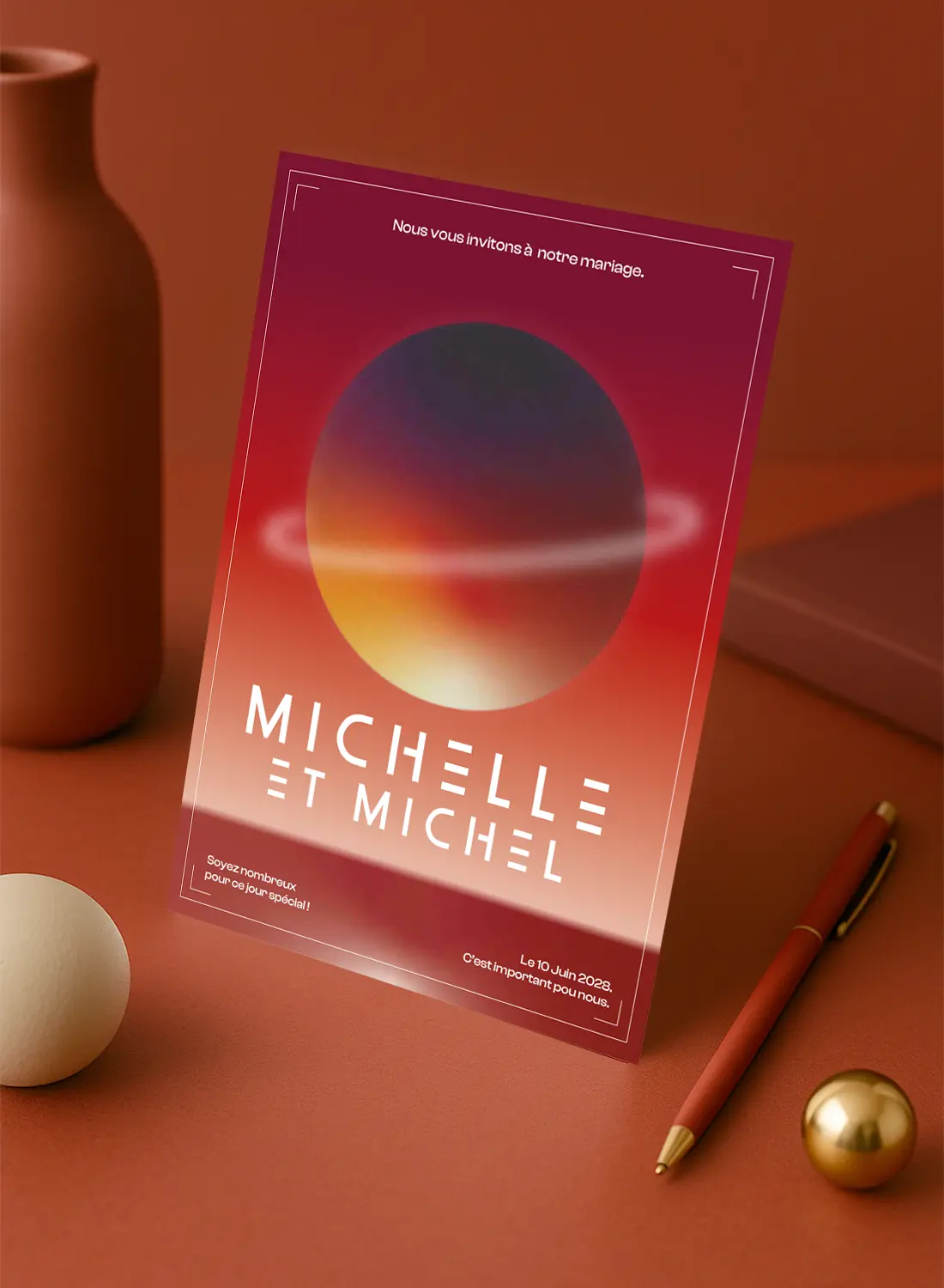 Au verso, le texte de votre invitation s’organise en colonnes nettes, encadré par un dégradé spatial intense. Chaque détail graphique a été pensé pour incarner une atmosphère unique : celle d’un amour brûlant, lumineux, interstellaire.