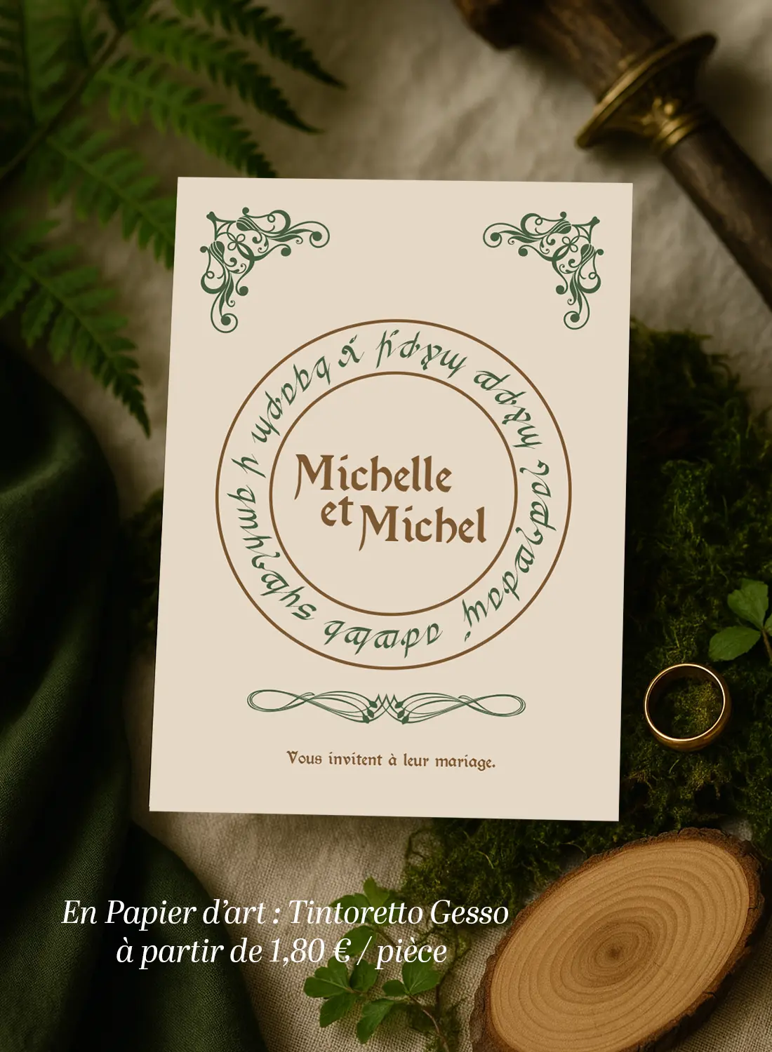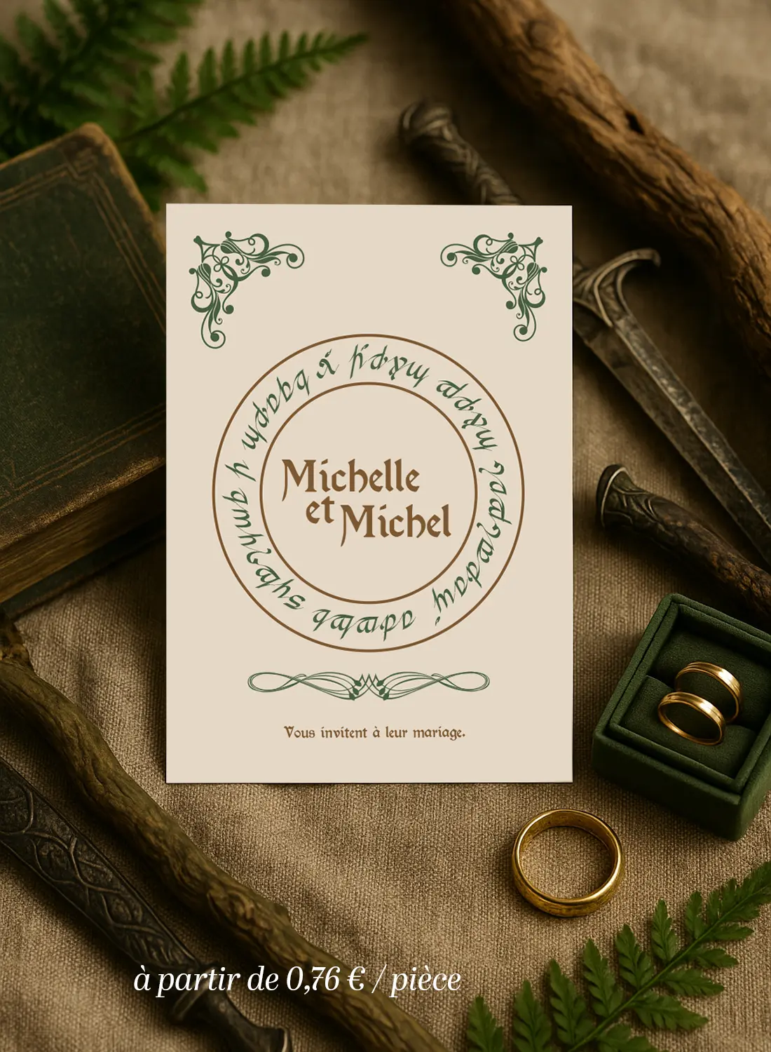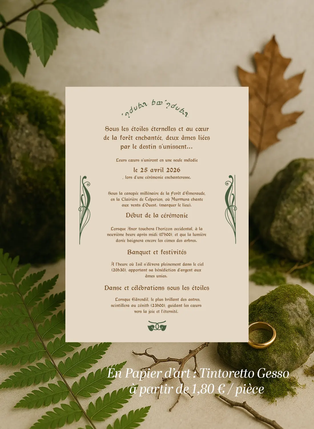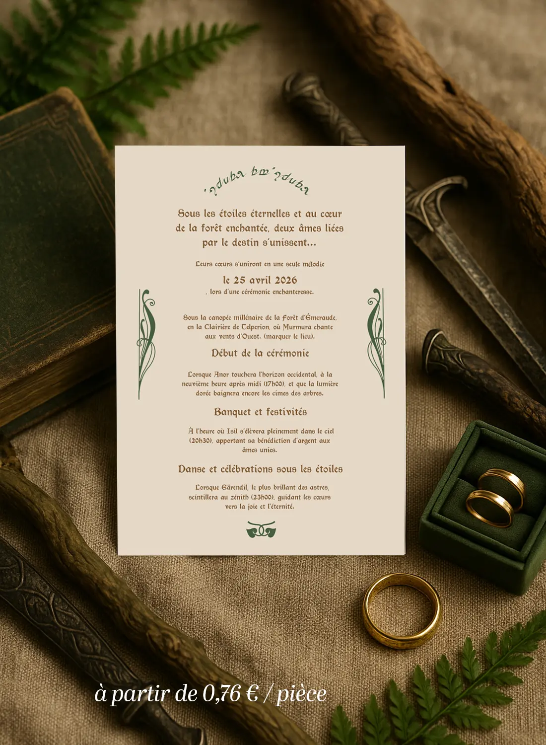 Un faire-part mystique et raffiné, parfait pour un mariage inspiré de la fantasy et des légendes elfiques.