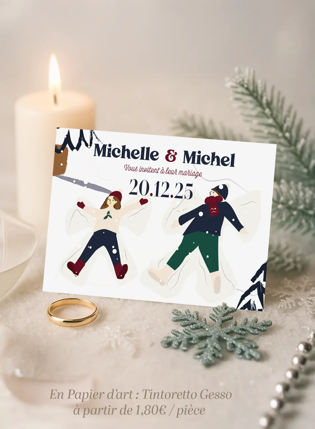 Avec ses personnages dessinés en train de faire des anges dans la neige, ce faire-part annonce un mariage plein de complicité et de bonne humeur. On est immédiatement plongé dans une ambiance hivernale ludique et chaleureuse.