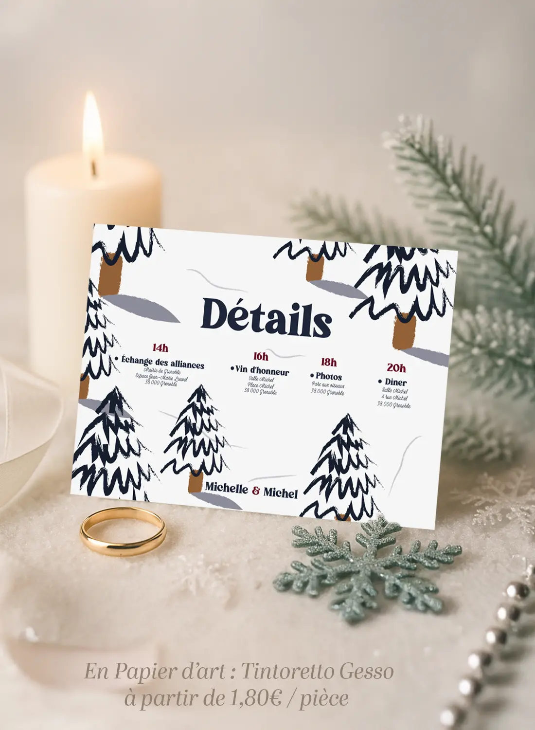 Le fond blanc neigeux est ponctué de sapins bleu nuit et de personnages aux vêtements rouge bordeaux et bleu profond, dans un esprit à la fois festif et élégant. La typographie reprend ces teintes avec contraste et caractère. Au verso, les détails de la journée sont joliment intégrés dans un décor de forêt stylisée, où les troncs bruns, les ombres grises et les arbres enneigés complètent l’harmonie visuelle.