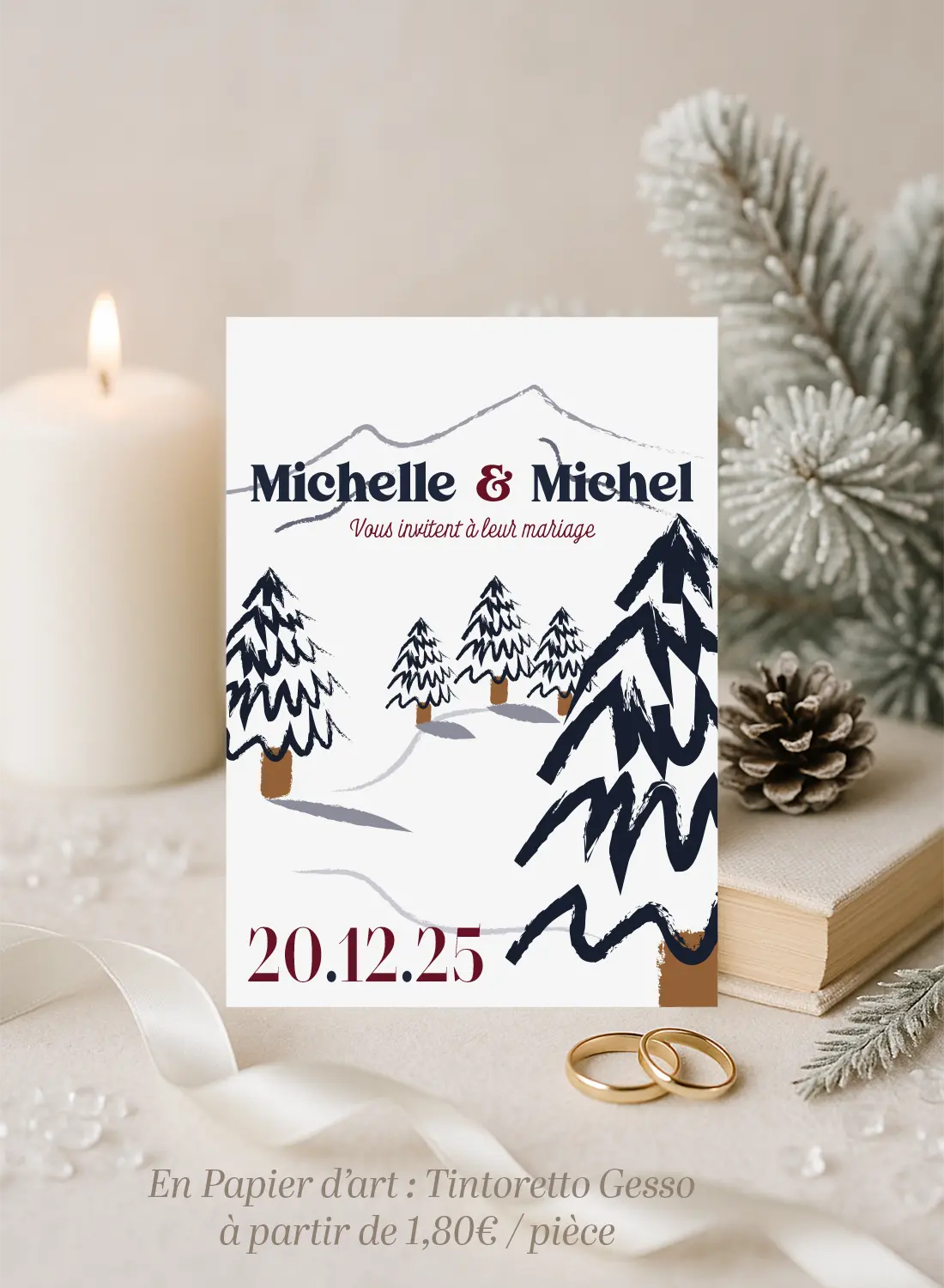 Un faire-part chic et nature, parfait pour un mariage d’hiver graphique et enchanteur.