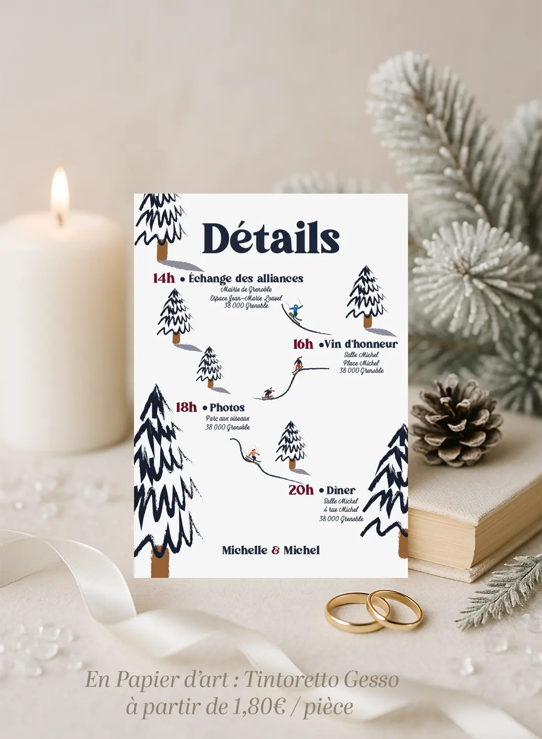 La palette repose sur des tons blanc neige, bleu nuit, brun chaud, et un bordeaux profond utilisé pour les prénoms et la date. Au verso, l’agencement vertical de la journée (alliances, vin d’honneur, photos, dîner) est fluide et illustré avec des petits personnages en pleine descente de luge ou en ski, pour une touche dynamique et joyeuse.