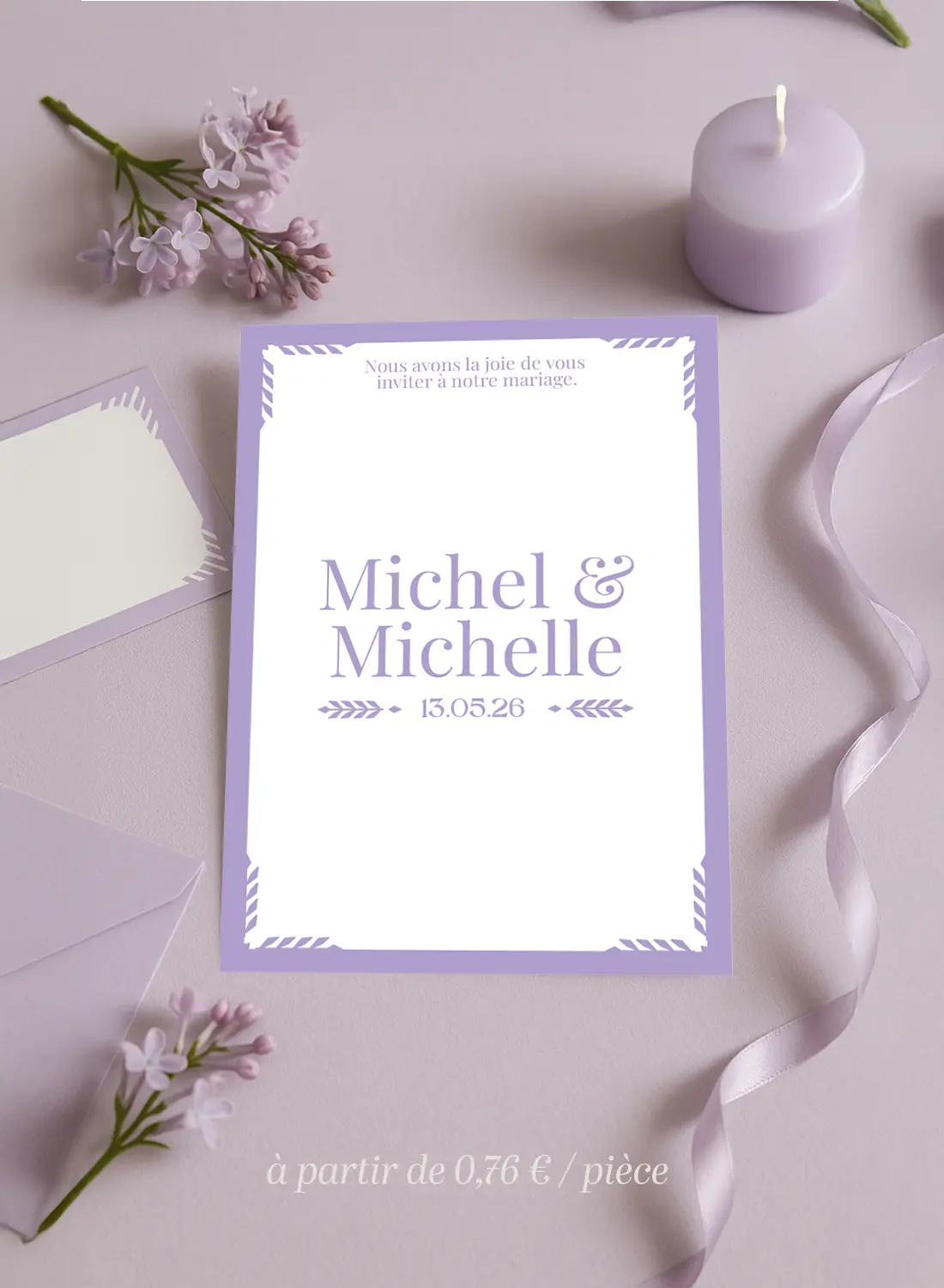 Ce modèle joue la carte du raffinement en lilas tendre sur fond blanc. Le recto présente les prénoms des mariés et la date de la cérémonie avec une grande clarté, dans une composition parfaitement centrée et bordée de motifs graphiques sobres. Un message d’invitation s’inscrit en haut avec discrétion.
