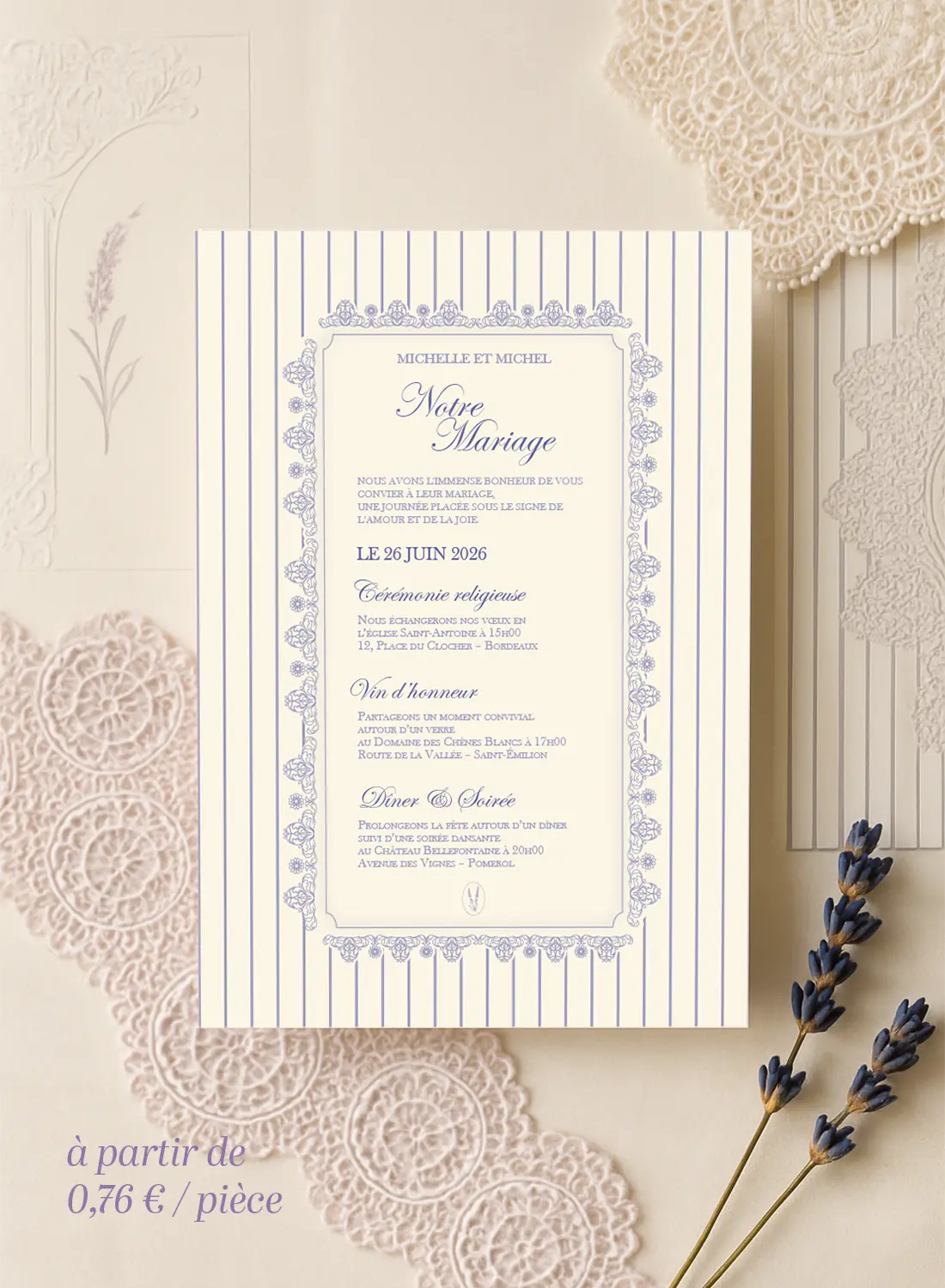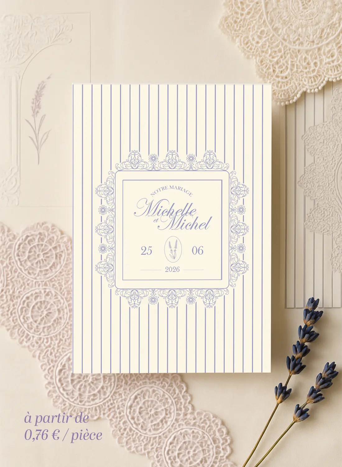 Le faire-part de la Collection Dentelle est un bijou de papeterie qui associe douceur visuelle et élégance intemporelle. Le recto présente un encadrement orné de fleurs stylisées façon dentelle, qui entoure les prénoms des mariés, la date du mariage et un petit emblème de lavande – signature visuelle de la collection. Le fond ivoire rayé verticalement apporte un effet chic et vintage, tout en conservant une excellente lisibilité.