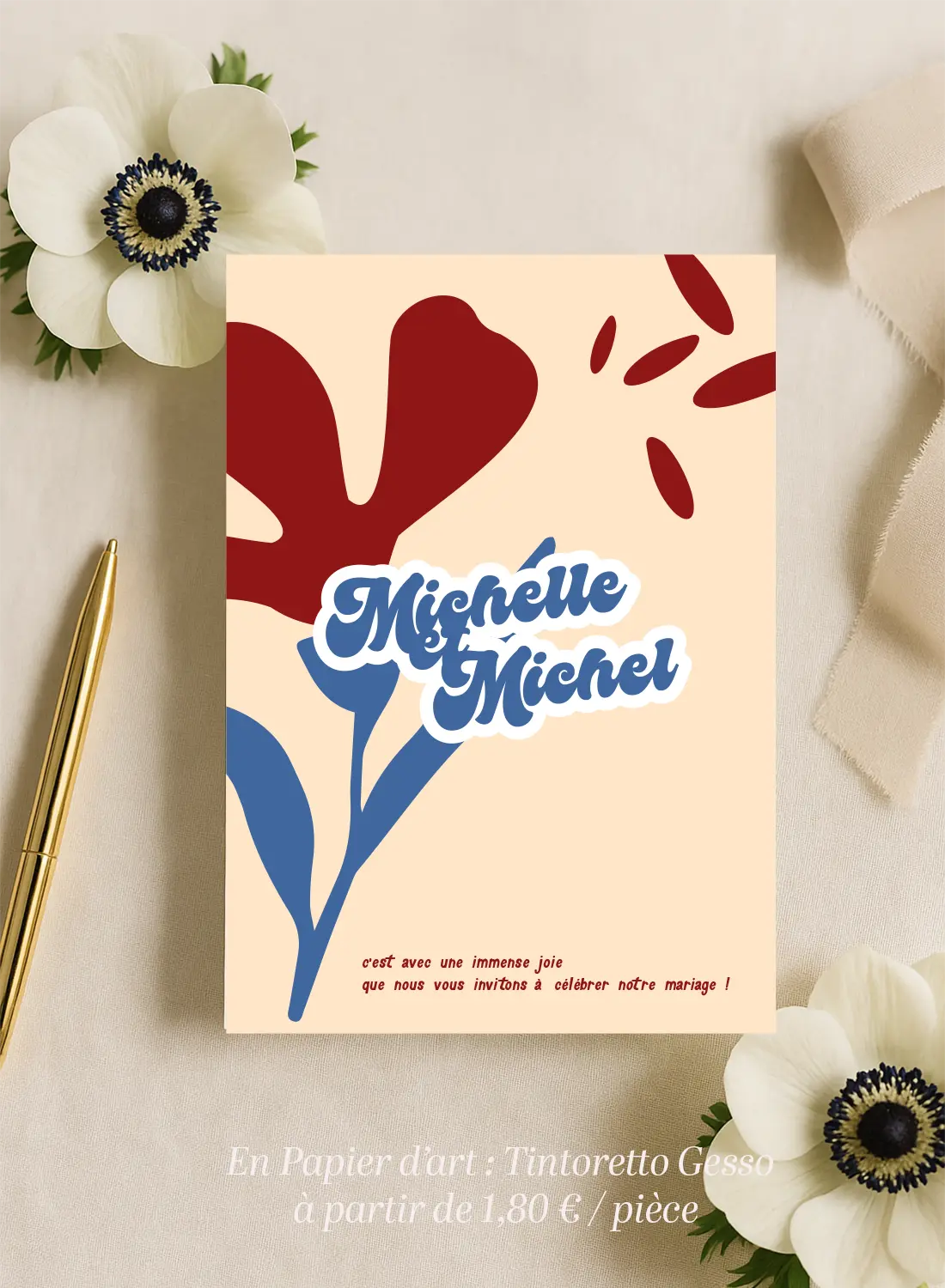 Le papier haut de gamme, les teintes chaleureuses et le graphisme floral stylisé créent une ambiance forte et joyeuse, parfaite pour un mariage qui vous ressemble.