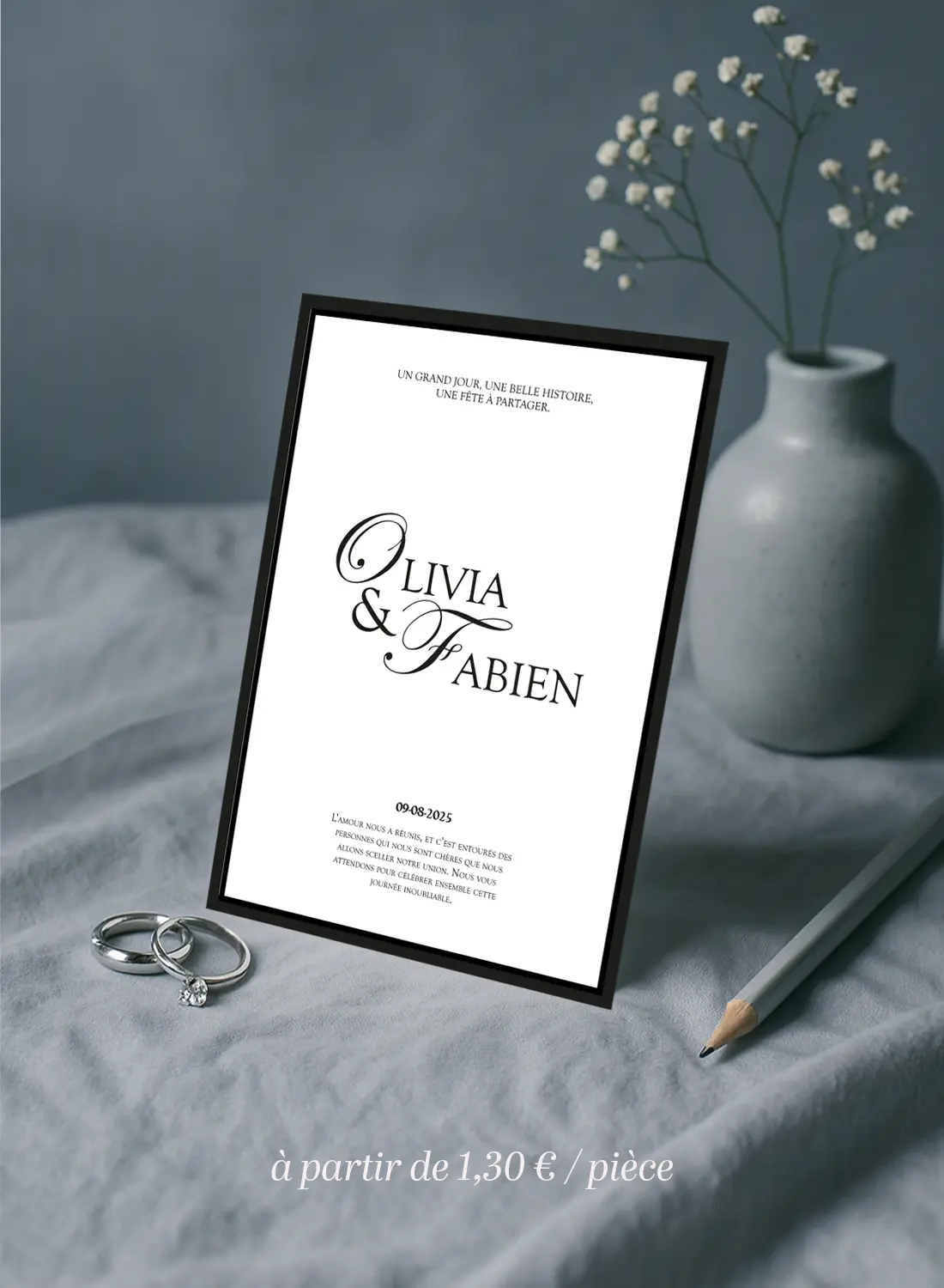 Nos modèles en semi-mesure ne sont pas modifiables en dehors des informations personnalisées (prénoms, date, lieu, etc.). Chaque création conserve ainsi son style et son équilibre graphique.