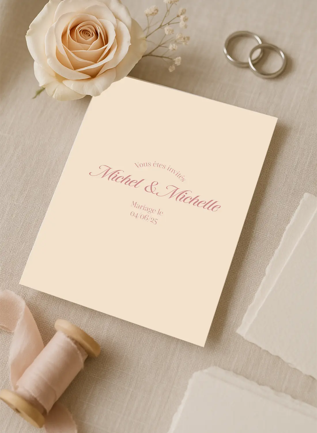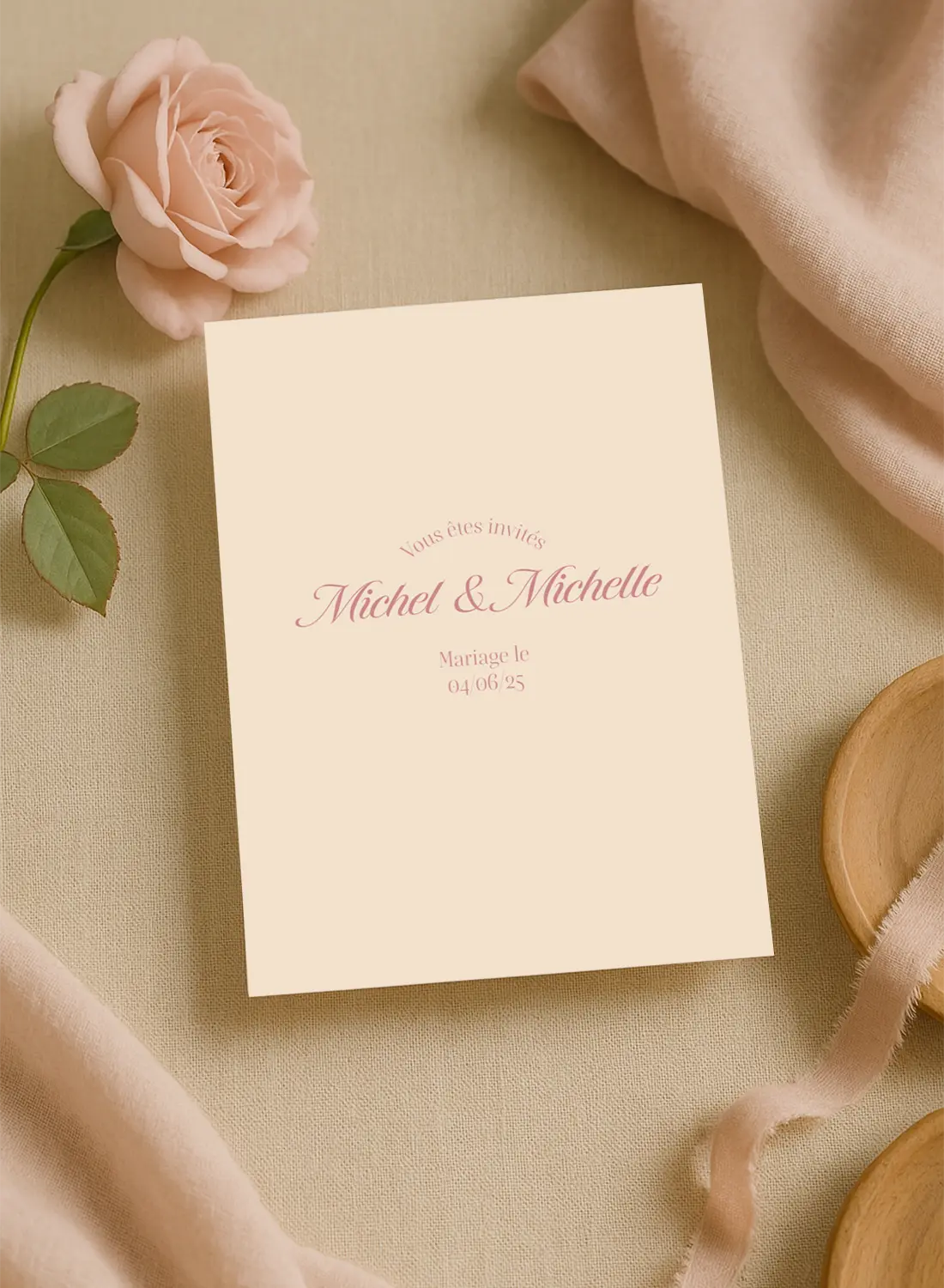 Un faire-part doux en rose poudré et ivoire, parfait pour une annonce minimaliste et romantique à l’élégance intemporelle.