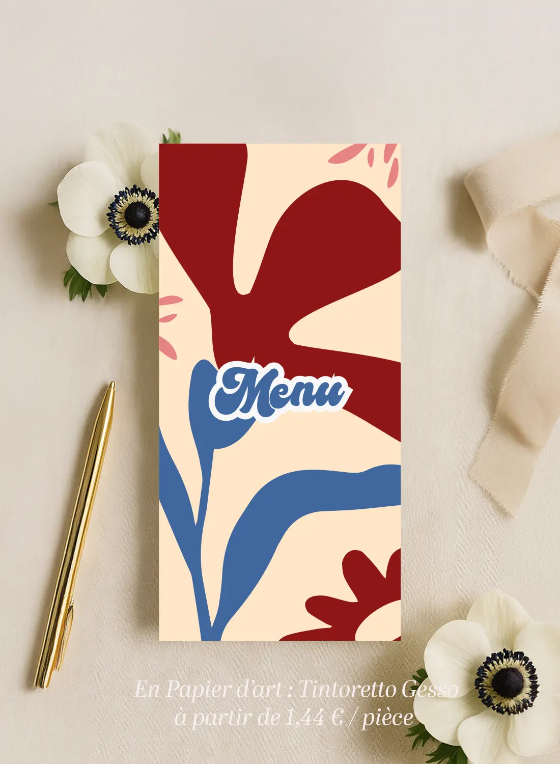 Menu au design floral et rétro décliné en 3 couleurs. Idéal pour une réception joyeuse et champêtre, pleine de style, de couleur et de poésie.