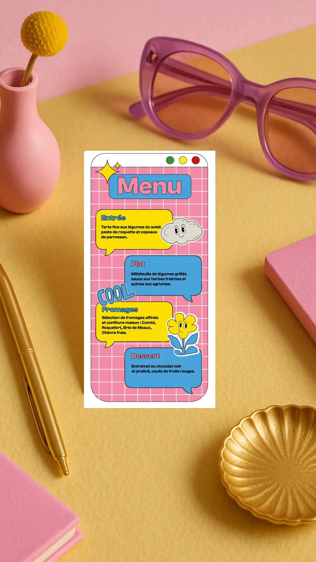Un menu de mariage rétro et coloré, façon appli mobile vintage, pour une table pop et décalée qui ne passe pas inaperçue.
