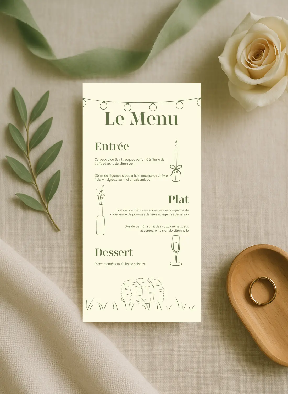 Un menu illustré pour un repas de mariage champêtre, entre fleurs, lumière douce et simplicité élégante.