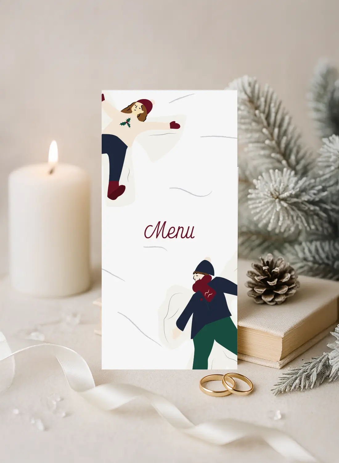 Ce menu de mariage reprend les codes graphiques ludiques de la collection Bonhomme de Neige : on y retrouve les mariés dessinés de façon tendre en train de faire des anges dans la neige, sur un fond blanc tout doux. À l’intérieur, le contenu gastronomique est élégamment mis en page, dans un ton rouge bordeaux plein de chaleur et de contraste.