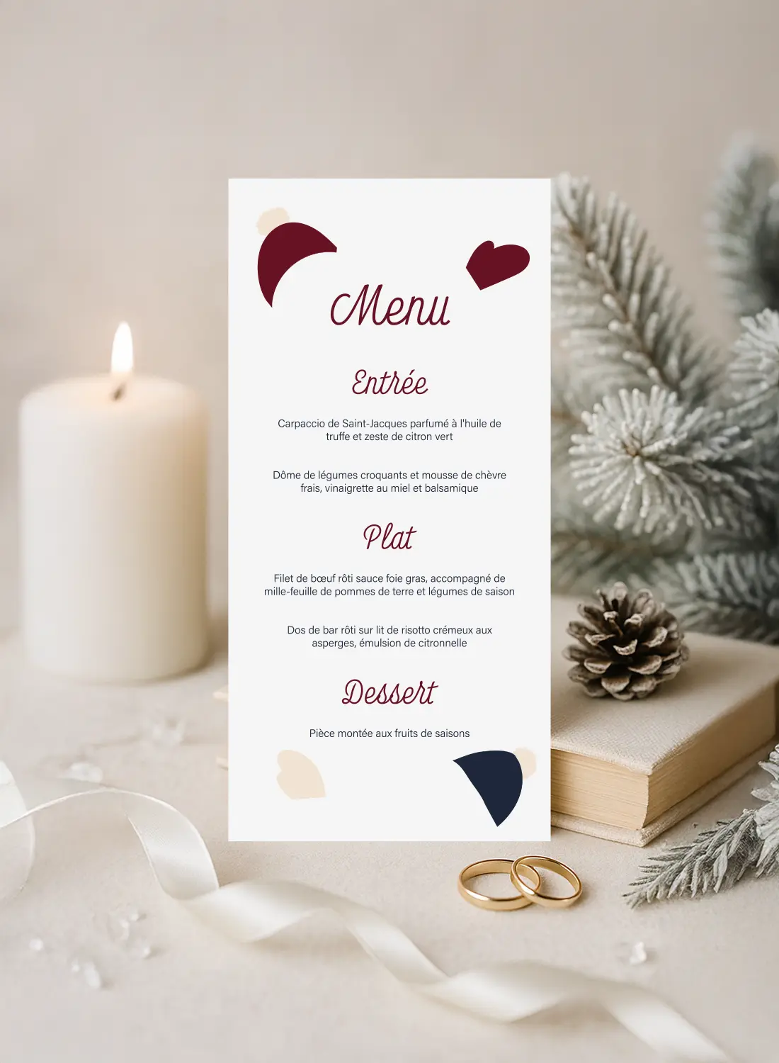 Menu de mariage illustré, aux tons neige, bordeaux et bleu nuit, pour une ambiance joyeuse et tendre dans un décor hivernal et complice.