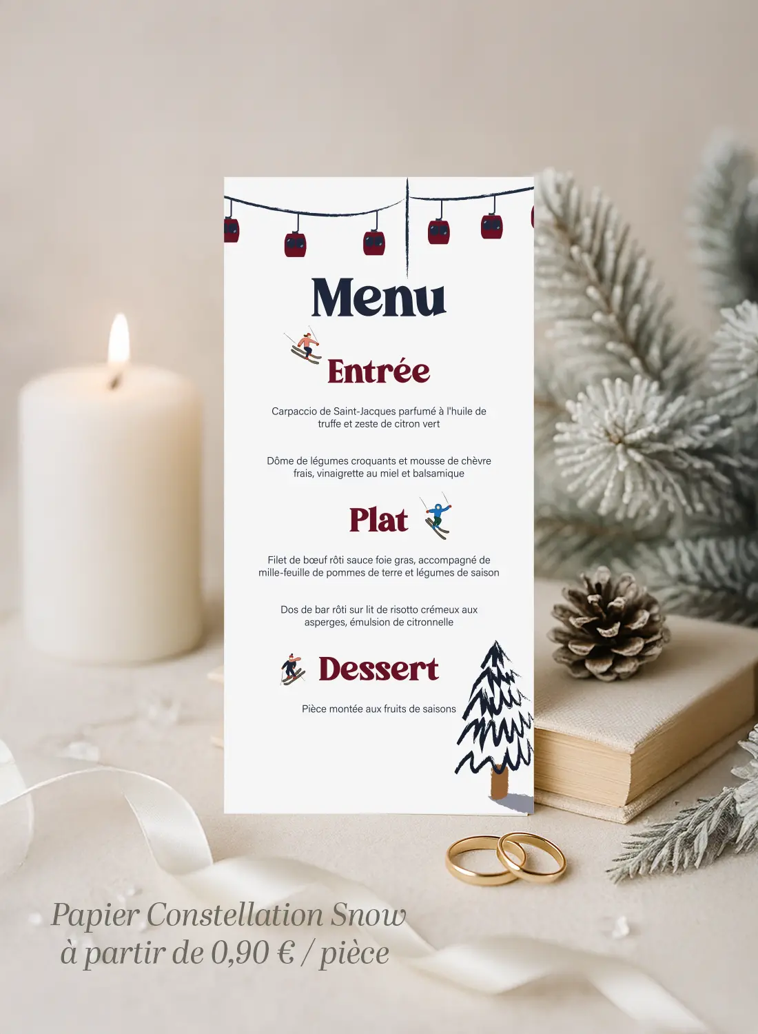 Un menu plus graphique et vivant, avec des skieurs et télécabines qui animent le haut et le long de la carte. Parfait pour une réception en altitude, ambiance station de ski chic !