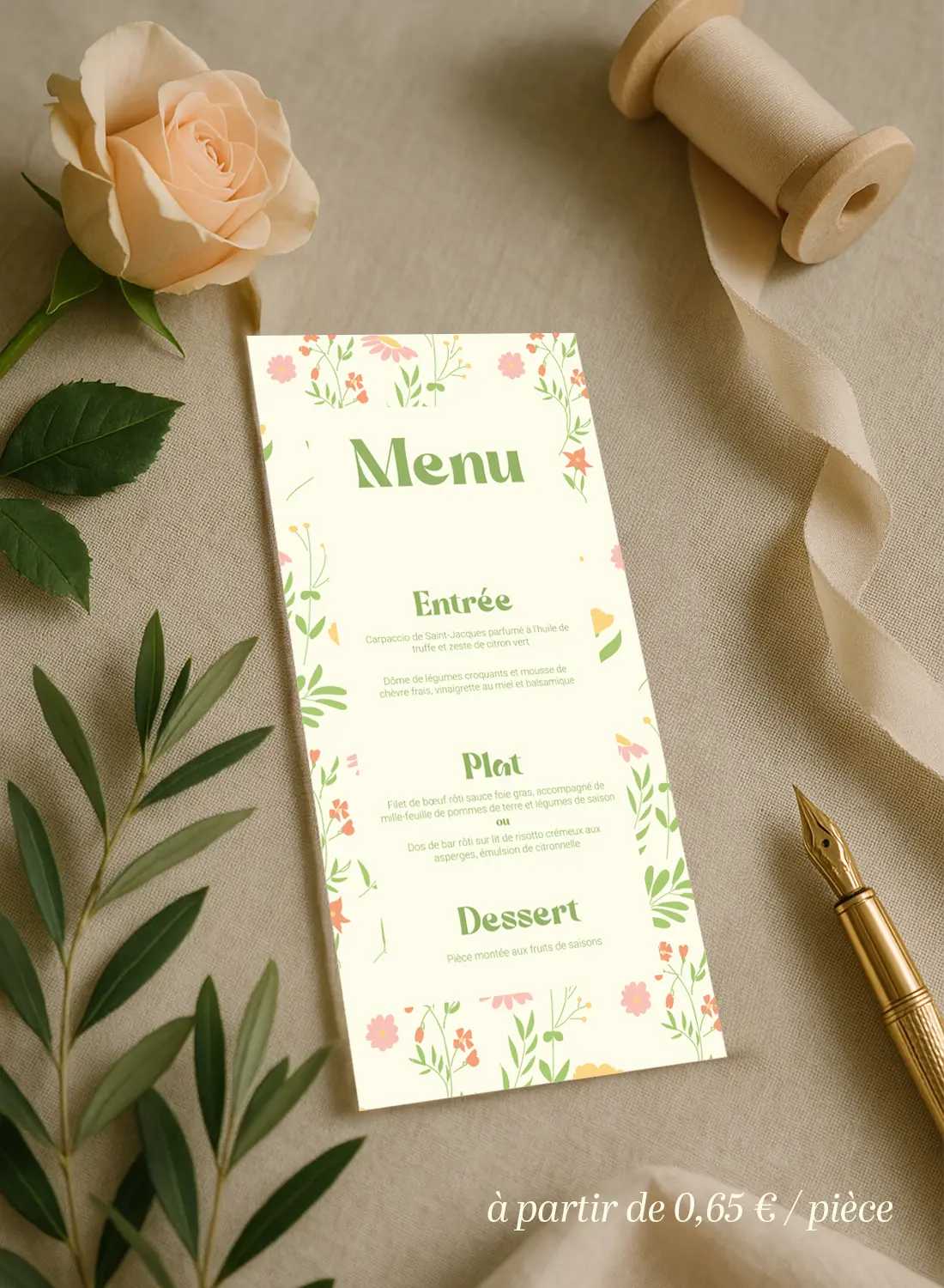 ✨ Nos créations sont disponibles à partir de 10 exemplaires. Vous verrez que pour les Menus, par exemple, un plus grand nombre de choix de quantités sont proposés pour mieux s’adapter aux besoins de chacun.