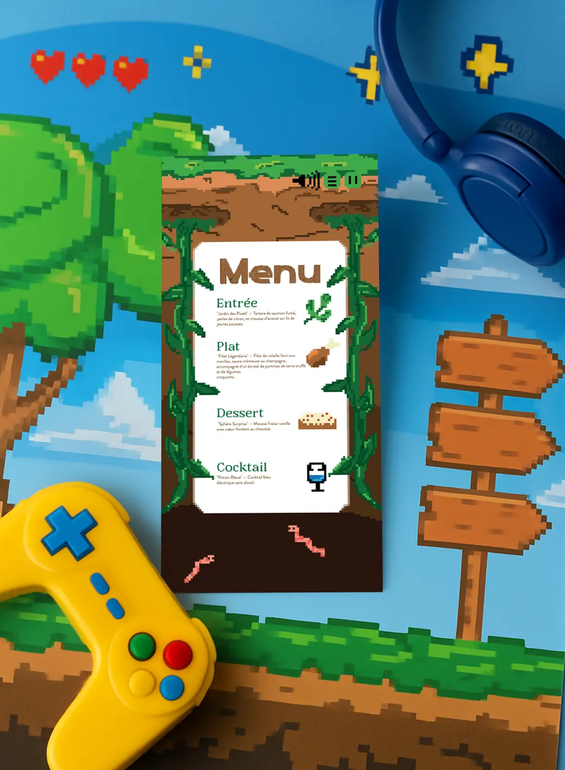 Ce menu s’inspire des décors de jeu vidéo rétro avec ses lianes pixelisées, ses icônes illustrées en 8 bits (petite cuisse de volaille, part de gâteau, verre cocktail…) et son ambiance de sous-sol forestier plein de surprises. Les intitulés des plats apparaissent dans une typographie claire, avec une structure verticale qui rappelle les panneaux d’objectifs dans les quêtes d’aventure.
