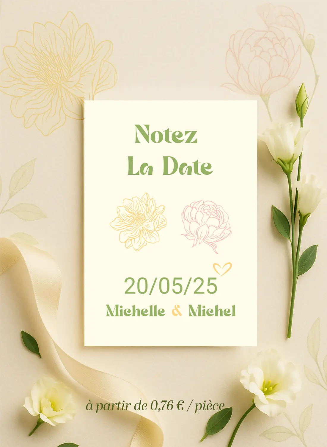 Cette carte se glisse naturellement dans une enveloppe ou s’offre à la main à vos proches pour leur permettre de bloquer la date à l’avance.
