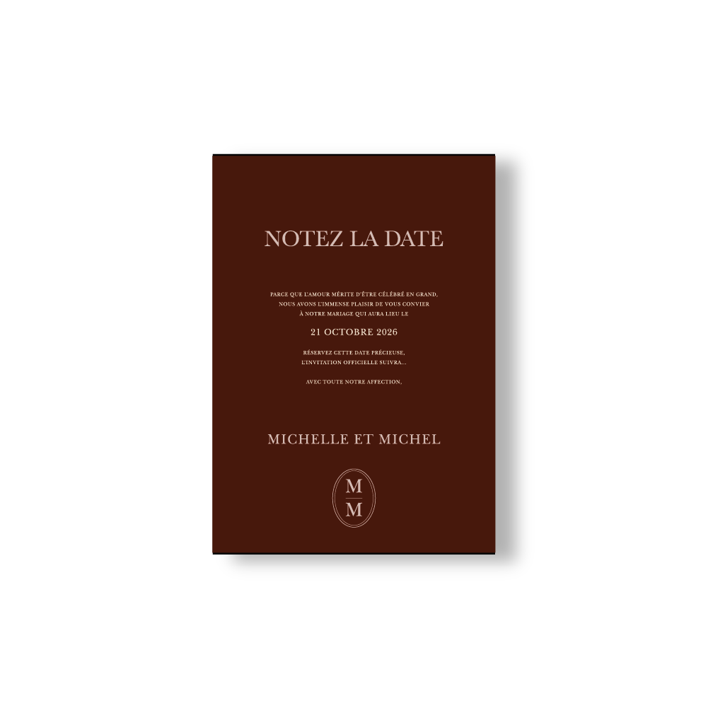 Avec son fond chocolat noir intense et sa typographie ivoire rosé, cette carte « Notez la Date » installe d’emblée une atmosphère chaleureuse et authentique. Le message est délicatement formulé : une promesse de célébration, une date précieuse à retenir, et l’élégance d’un design centré autour d’un monogramme classique.
