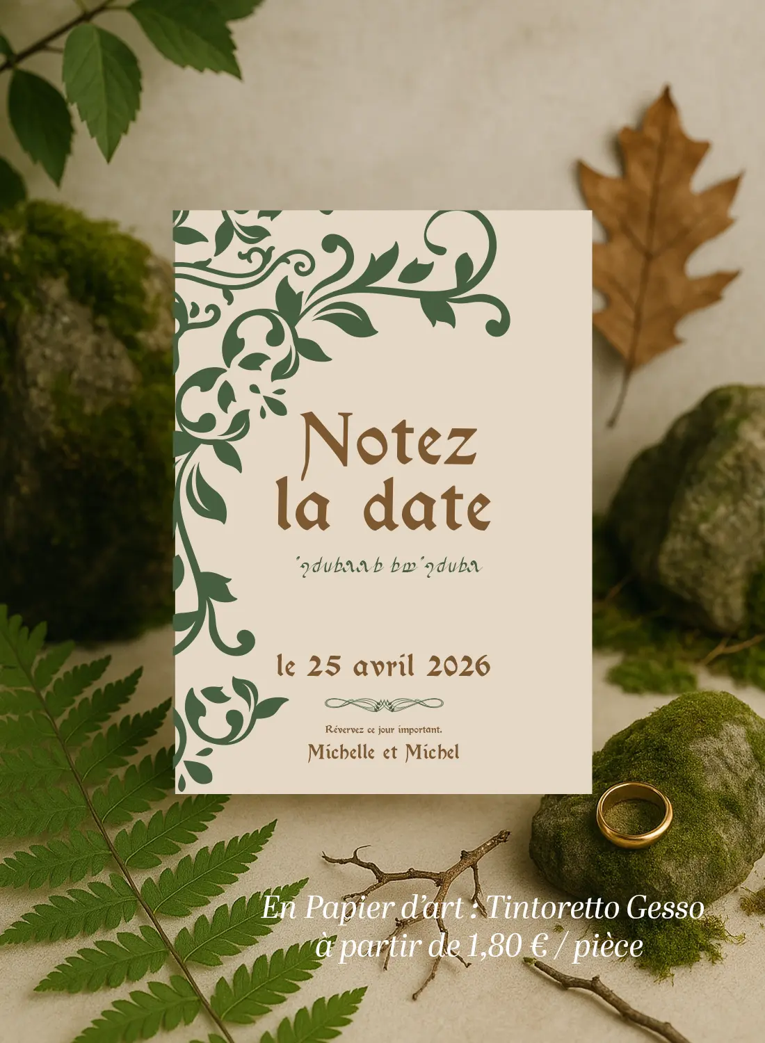 Le fond beige doux évoque le parchemin ancien, tandis que les motifs végétaux verts qui l’enlacent semblent pousser d’eux-mêmes, comme dans une forêt vivante. Le texte brun profond donne à l’ensemble une touche à la fois rustique et raffinée. Chaque détail a été pensé pour faire de ce Save the Date un véritable artefact de votre univers imaginaire.