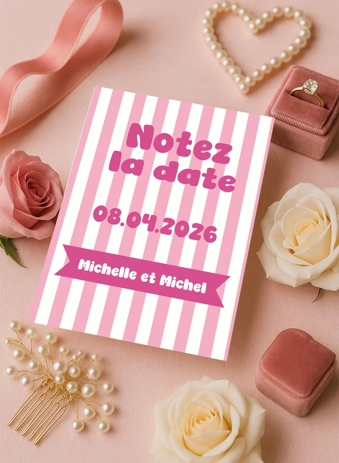 Carte “Notez la date” à rayures roses avec ruban fuchsia – parfaite pour annoncer la date de votre mariage avec fun et tendresse.