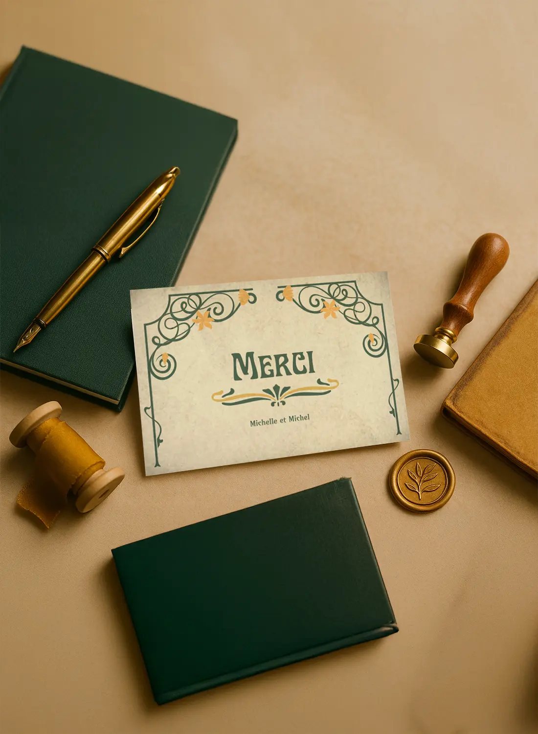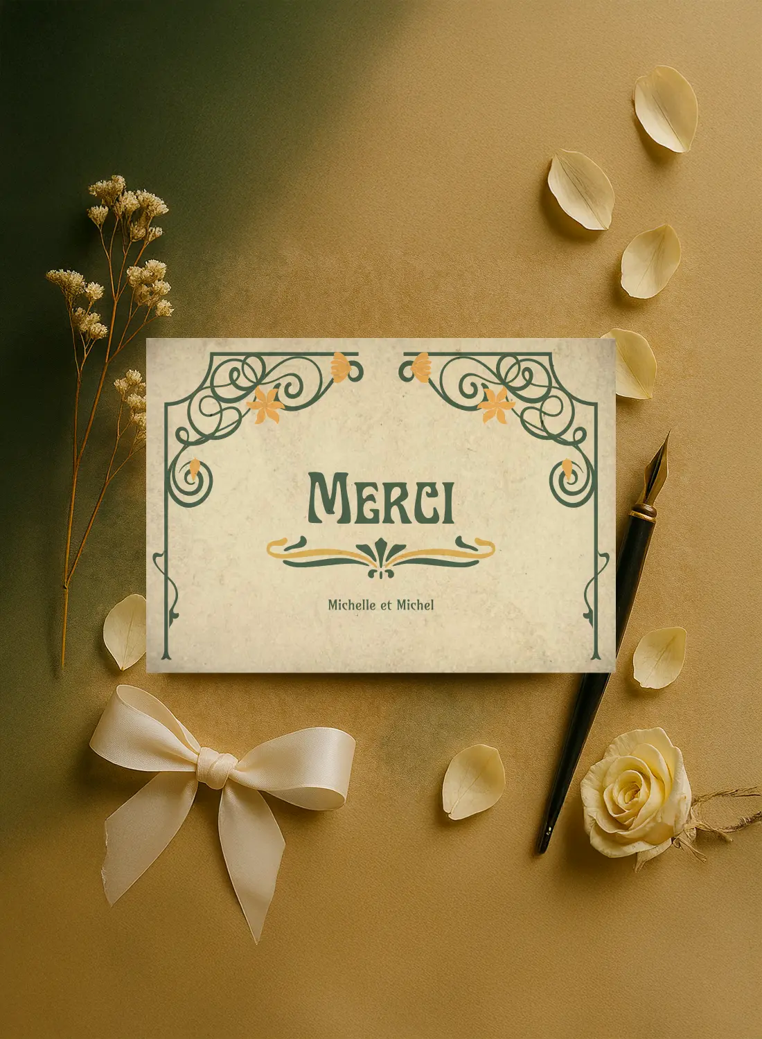 Carton de remerciement au style Art Nouveau, délicatement illustré dans l’esprit des affiches anciennes. Un dernier clin d’œil élégant.