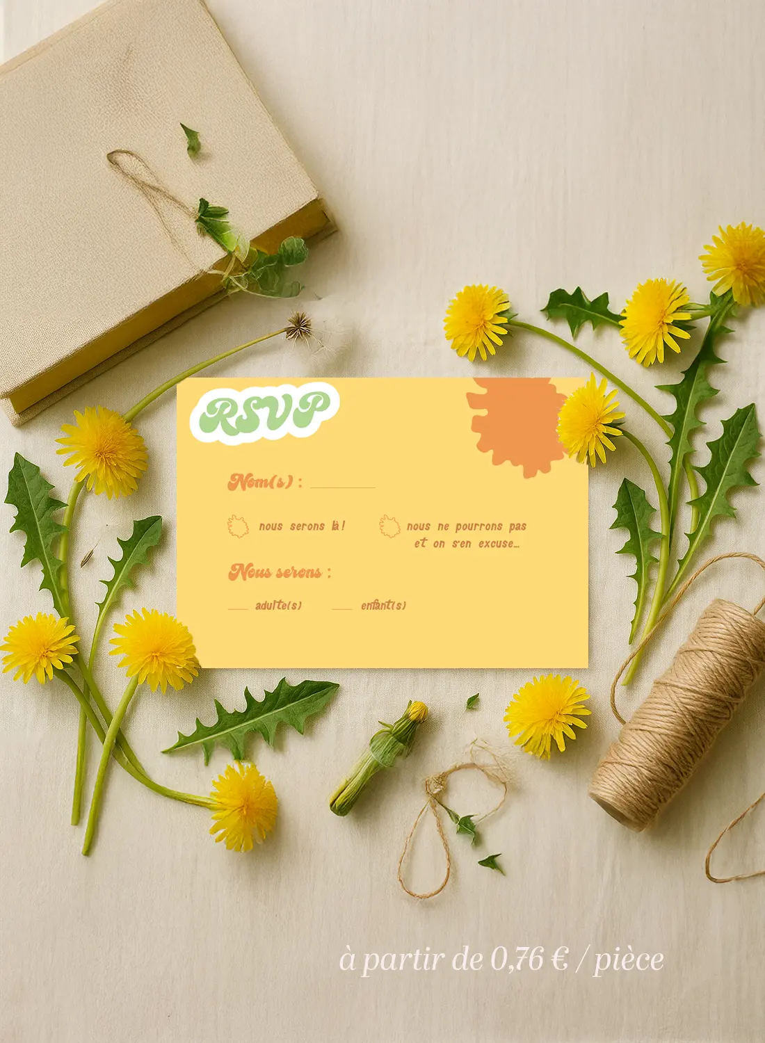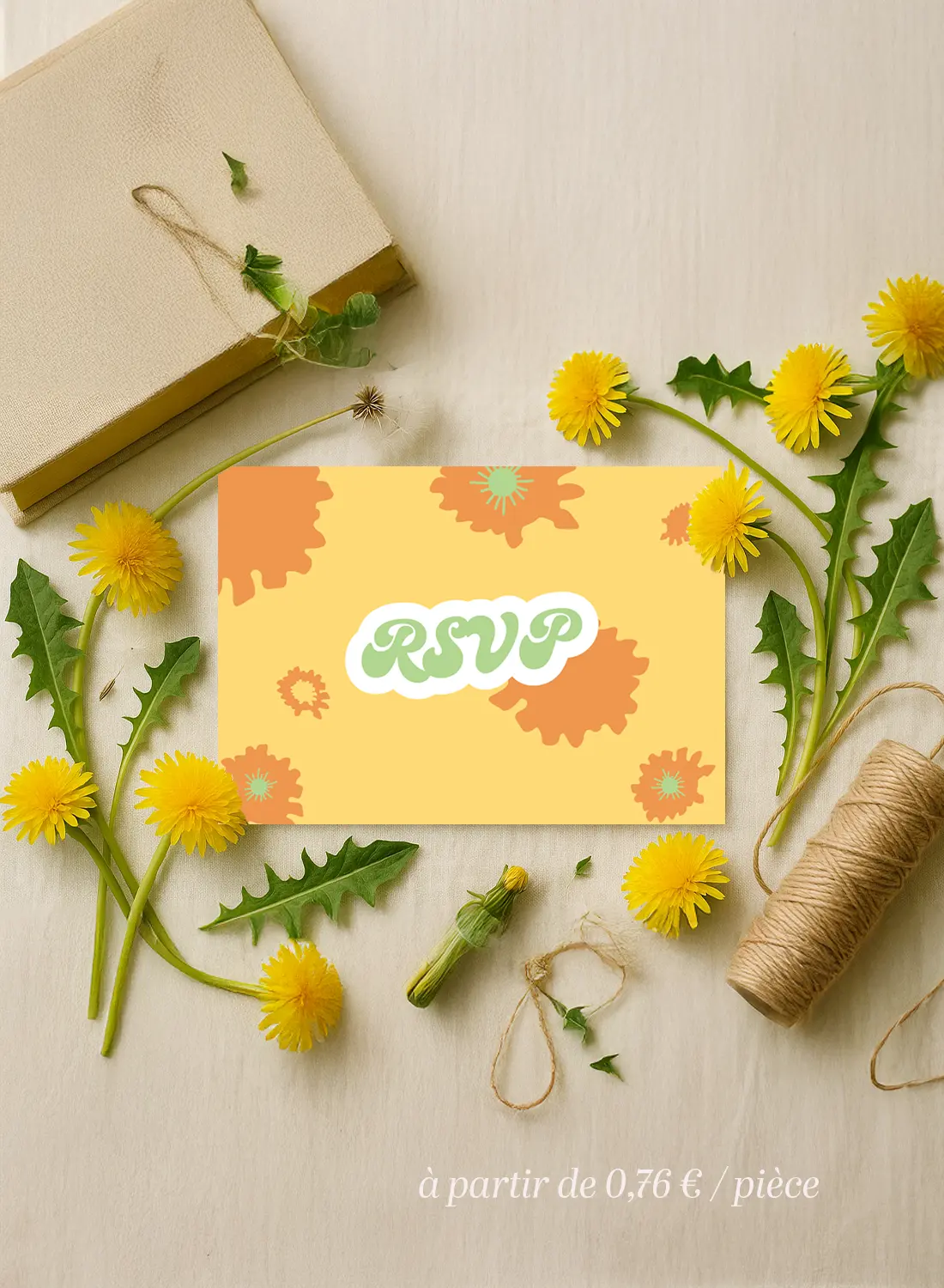 RSVP ensoleillé de la collection Pissenlit. Une touche graphique, fraîche et vitaminée pour une papeterie joyeuse et pleine d’énergie.