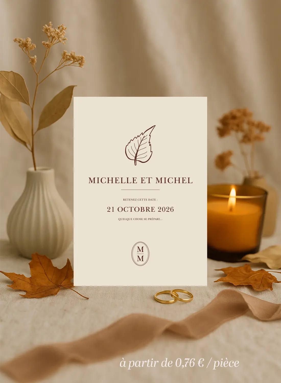 Save the Date crème & chocolat à l’ambiance automnale. Élégante, simple et mystérieuse : parfaite pour annoncer la date avec style. 🍂