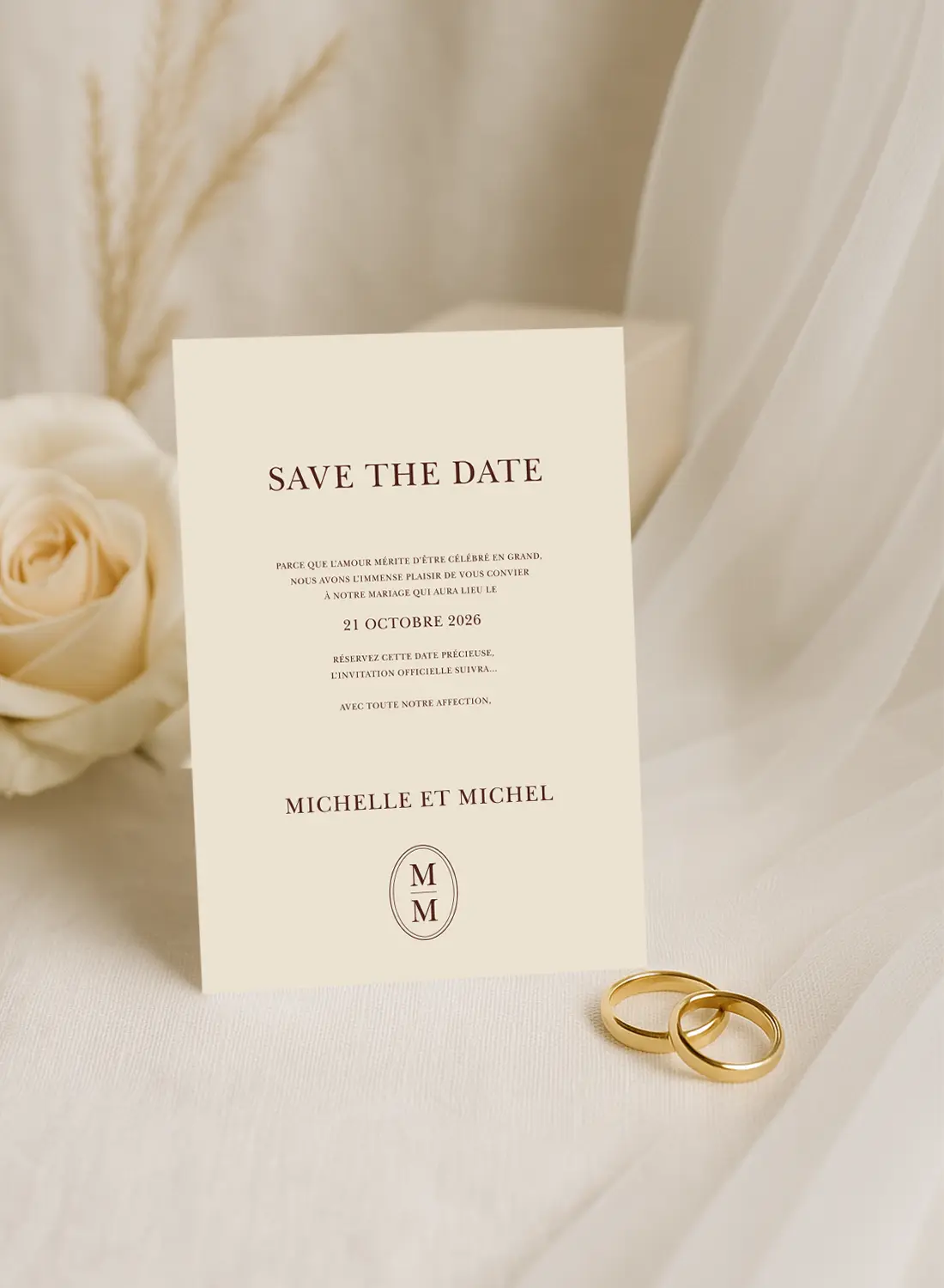 Cette carte Save the Date au fond crème clair est un concentré de raffinement. Sa typographie chocolat, à la fois fine et chaleureuse, met en valeur la date du mariage, centrée dans une composition parfaitement équilibrée. En bas, le monogramme “M M” vient signer le design avec une touche artisanale et intemporelle.