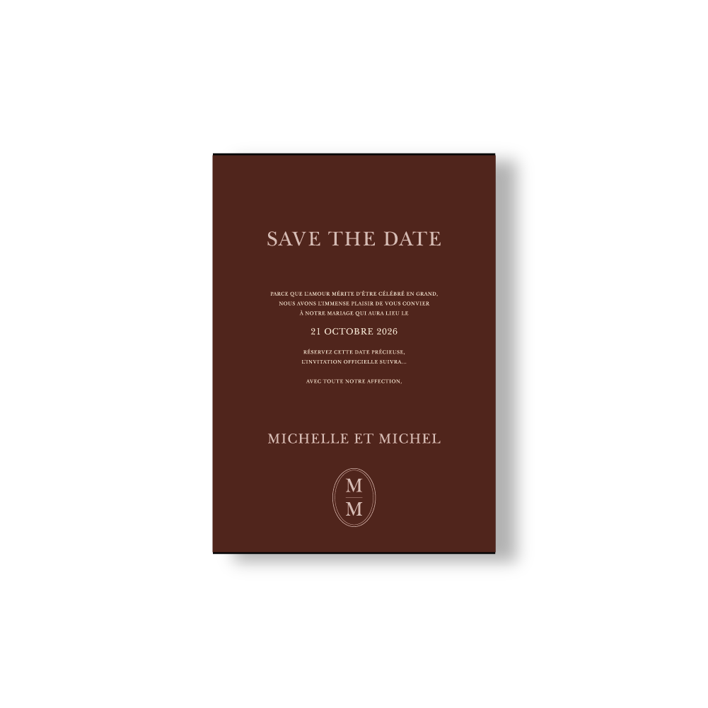 Avec son fond chocolat profond et sa typographie ivoire rosé, cette carte sobrement élégante reprend la même composition que la version “Notez la Date”, en adoptant cette fois un ton plus international. Le message est doux, la date est au cœur de la mise en page, et le monogramme central apporte la touche finale d’authenticité.