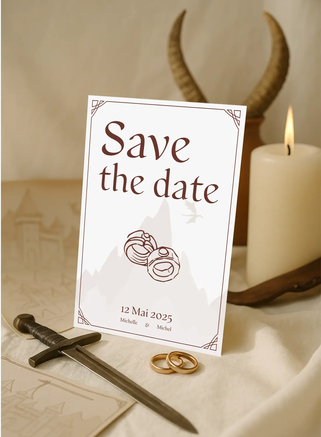 Ce Save the Date donne le ton dès les premiers battements d’ailes ! Avec son paysage montagneux en arrière-plan, ses anneaux enlacés et son style médiéval, il annonce une union aussi légendaire qu’originale. L’oiseau qui plane au loin n’est peut-être pas un simple oiseau, d’ailleurs…