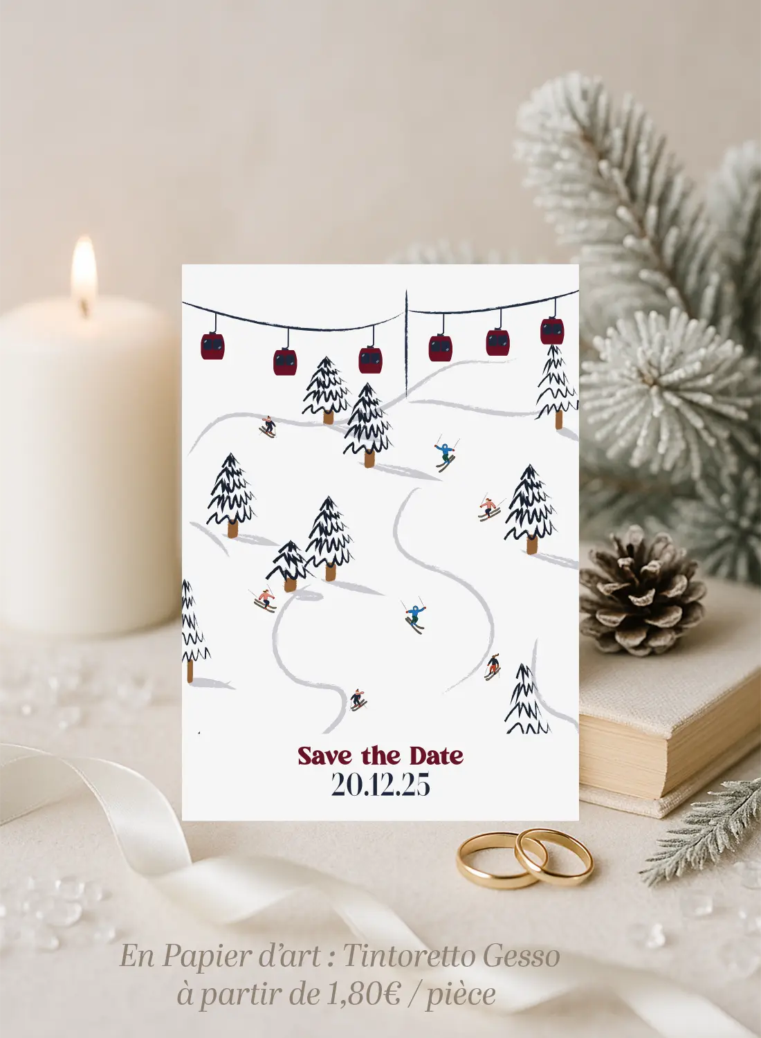 Ce Save the Date plonge immédiatement vos invités dans une ambiance de station de ski chic et festive. Sur fond blanc neige, des skieurs laissent leurs traces entre les sapins bleu nuit et les télécabines bordeaux, dans une mise en scène dynamique et joyeuse. La date du mariage, en bas de la carte, est parfaitement lisible tout en s’intégrant à l’esthétique générale.