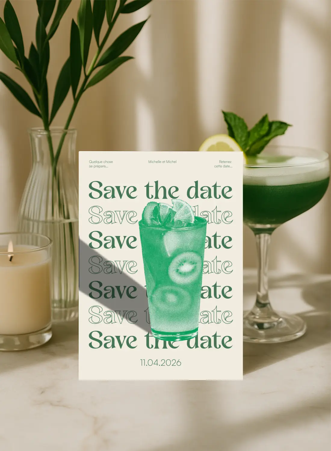 Annoncez votre mariage avec cette carte Save the Date festive et graphique, illustrée d’un cocktail vert acidulé, parfaite pour donner le ton dès le départ.