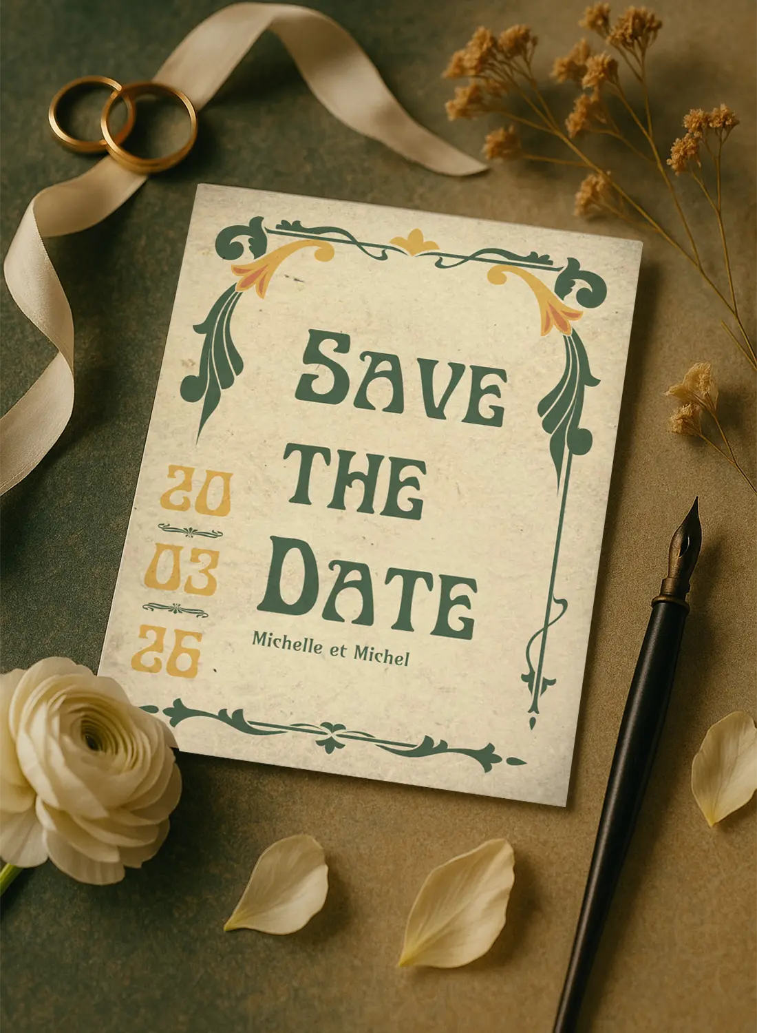 Save the Date au style Art Nouveau, inspiré des affiches anciennes avec arabesques végétales et typographie rétro. Élégance garantie.
